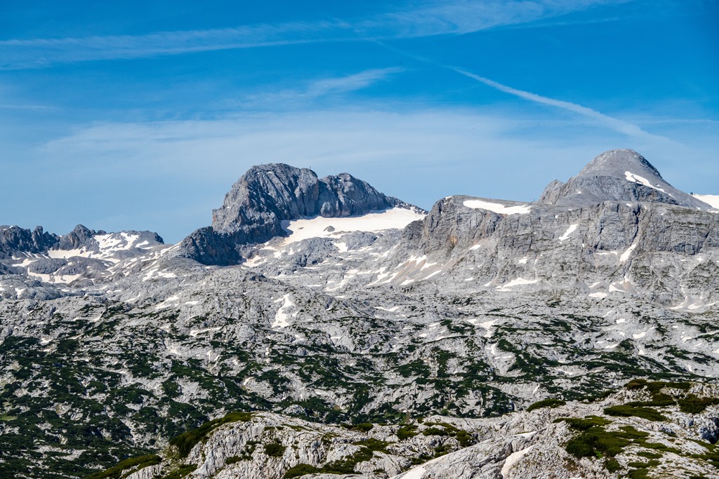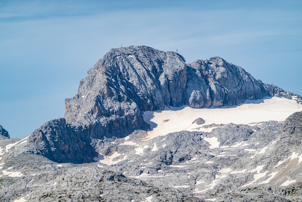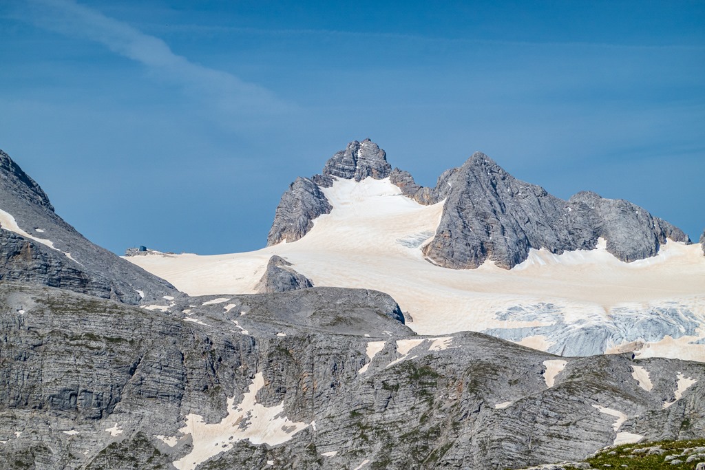 A Dachstein glccserei és a kép közepén őfensége a Hoher Dachstein, alig-alig 3000 m alatt. A gleccser szürke részei (jobboldalon) a sebek, ahol az idei hó védelme alól előbukkan az üvegszerű évszázados jég.