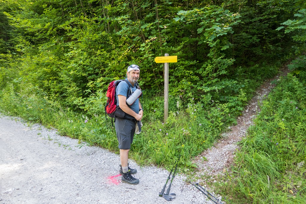 Az út első része szinte teljesen sima terepoen fut. Széles erdészeti úton, bő egy órán át menetelünk a tulajdonképpeni kaptatók kezdetéig. Egy jobbra leágazó letérőhöz érkezünk. Ez egy nem hivatalos, de jól követhető rövidítés kezdete, ami cirka egy negyedórával megrövidíti az egyhangú menetet (lenti képek).