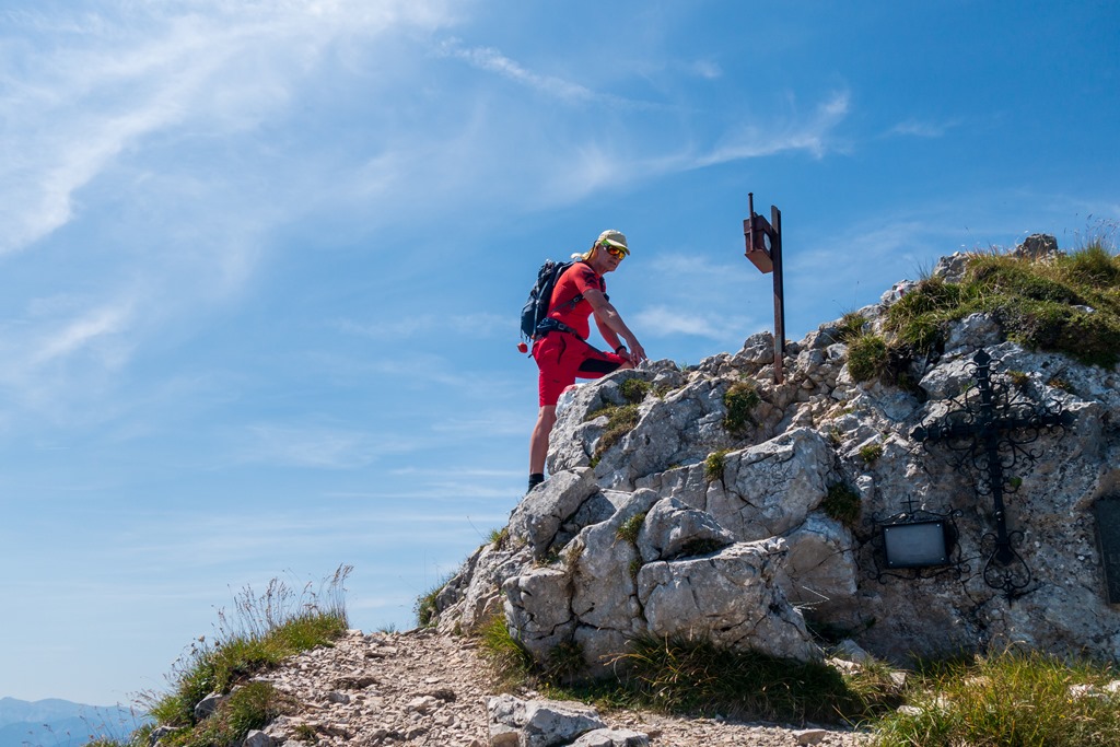 Szelíd, füves plató fogad odafenn (fenti képek). Mindjárt le is telepszünk egy alkalmas helyen, hogy koccintsunk a megéltekre. Csak ezután kerekedünk fel ismét, hogy még kötelező fejhajtással tisztelegjünk a hegy szellemei és a csúcskereszt elött (1895 m / 12:50).