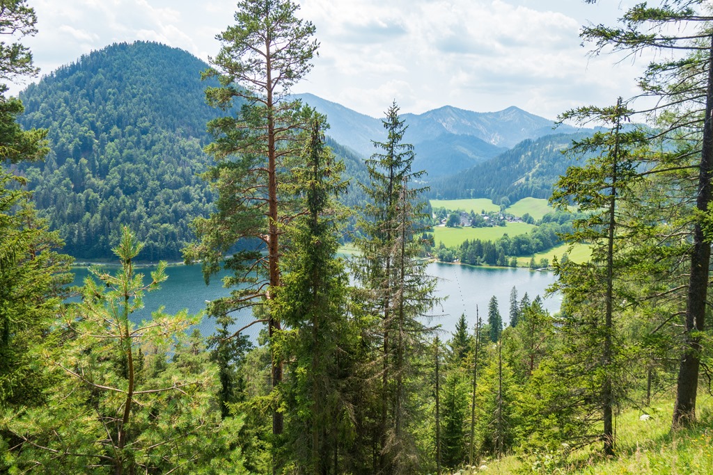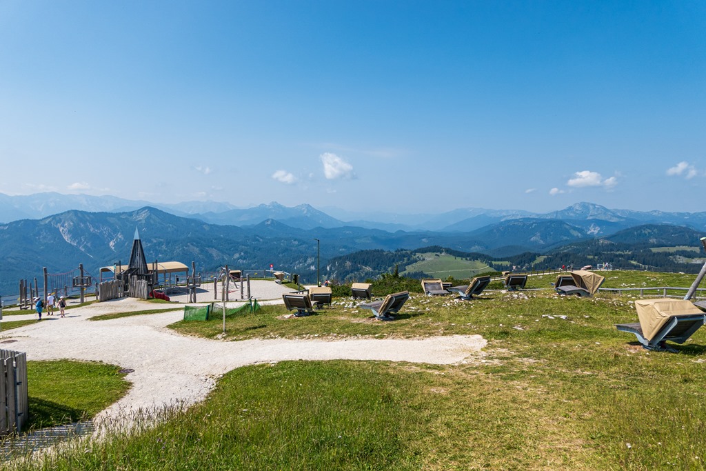 Átellenben a Mariazeller Bürgeralpe látszik a sípályákkal, és jobbra a képben a hegy mellett maga Mariazell