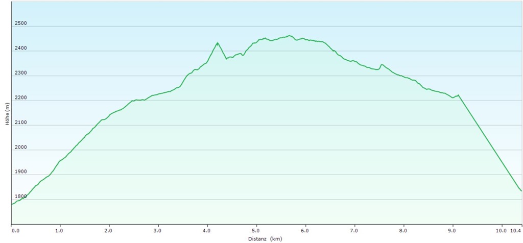 A további út folytatása. A háttérben az imént megmászott Goisele. A hegy bal oldalán a visszafelé vezetö út csíkja.