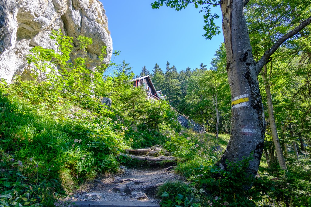 Egy óra alatt végzek a szurdokkal, majd jön a kaptató a Kientalerhütteig. Emlékezetes számomra, hogy amikor először jártam itt (2011-ben), teljesen lefulladtam. Képtelennek éreztem magam folytatni a Klosterwappenig. Irigykedve figyeltem egy nyugdíjas korú túrázót, amint nagy lendülettel indul felfelé. Most nincs ilyen dilemmám. A Kientalerhütte körül serénykednek (fenti kép), sivít a cirkula, dolga van a láncfűrésznek. Tataroznak-e vagy mi, nem tudom, de olyan a hangzavar, hogy inkább feljebb megyek egyel, és ott ülök le egy fenyőfa tövében elfogyasztani varázsitalomat.