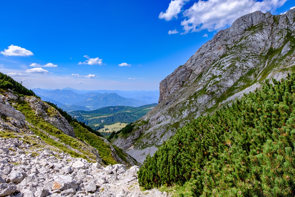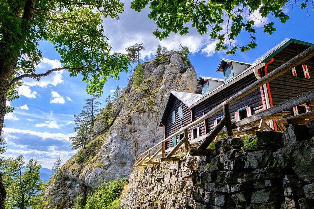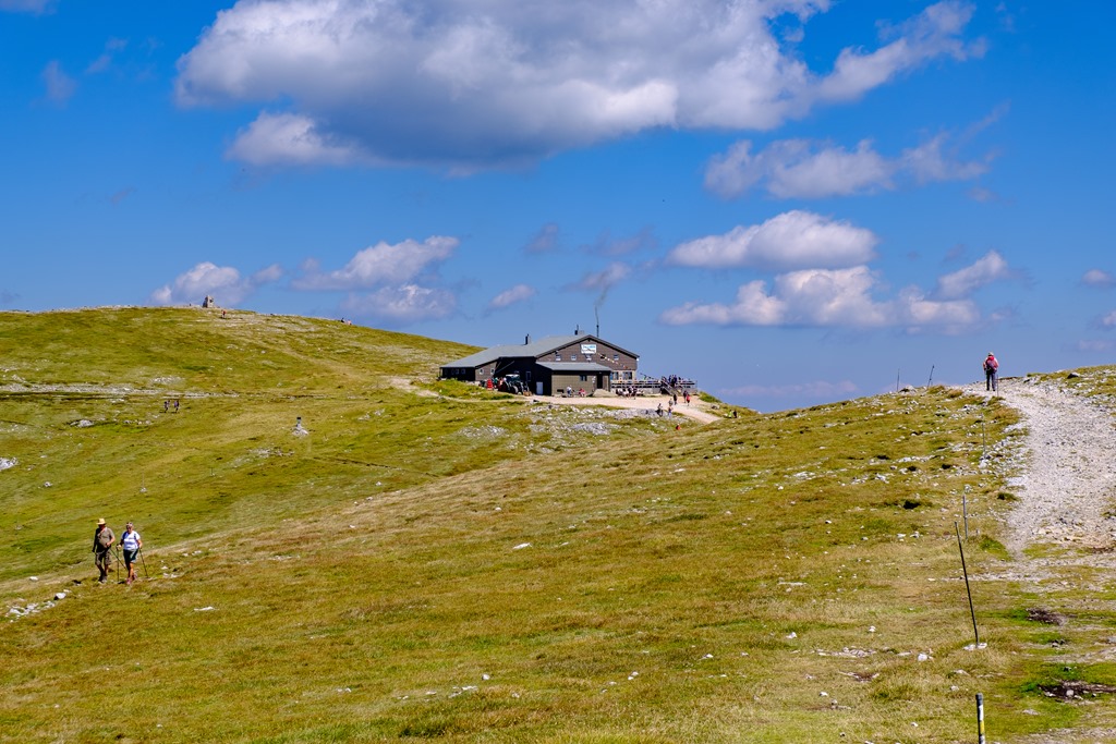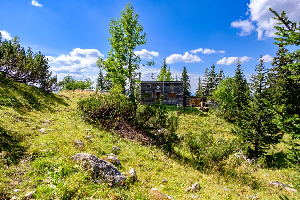 Még cirka 10 perc a Fischerhütte, ahol elkölthettem jól megszolgált déli ebédemet. Durván 35-40 percet töltök a Hütteben, aztán tovább állok a meredek Wurzengerbaneon át. Télen itt, hóval kitöltve, könnyebb lejönni. Most óvatoskodom, alattomos sziklamorzsalékkal minduntalan számítva. Egy óra elteltével érem el a hegyi mentőszolgálat kunyhóját (Krempelhütte, lenti képen). Itt balra fordulok a Grafensteigen és nagyrészt erdőben haladva, 15-20 perc alatt érkezem újra a Witzani-kresztehez (13:50).