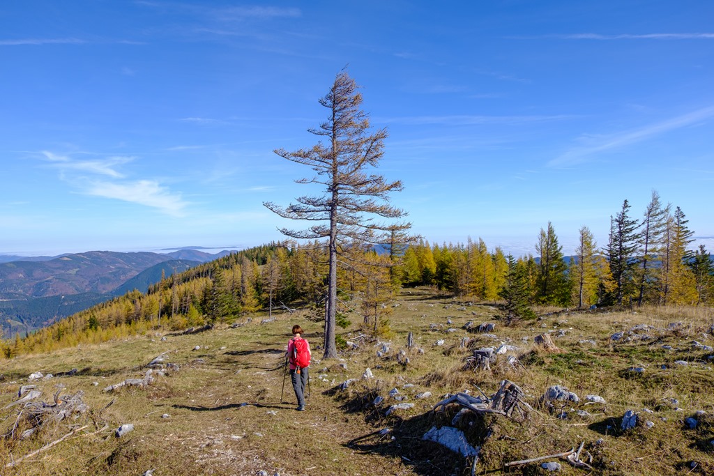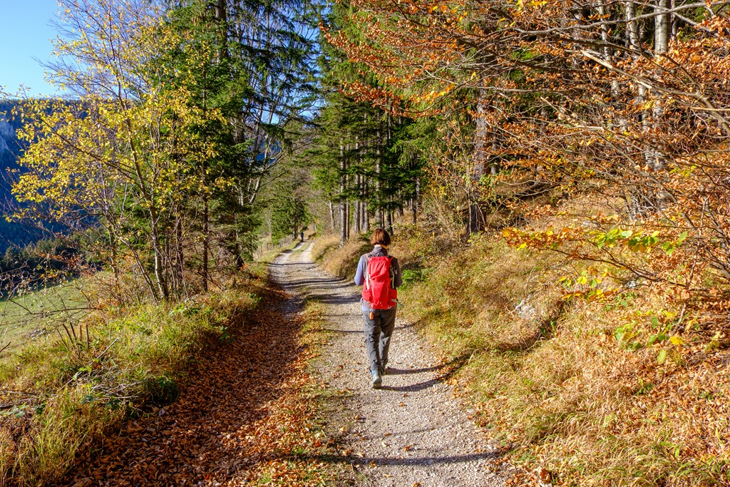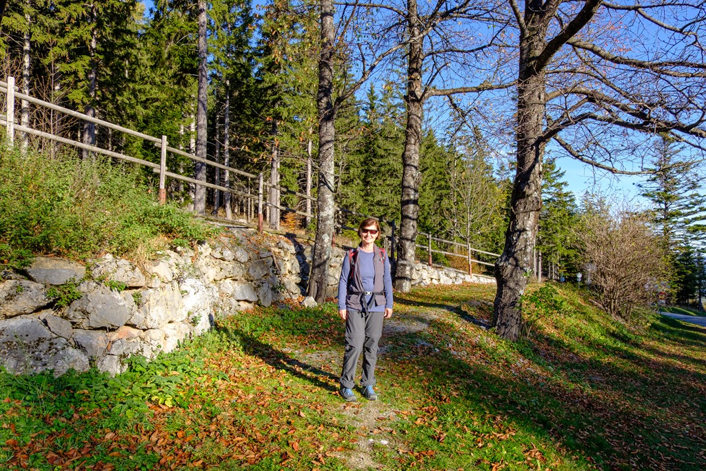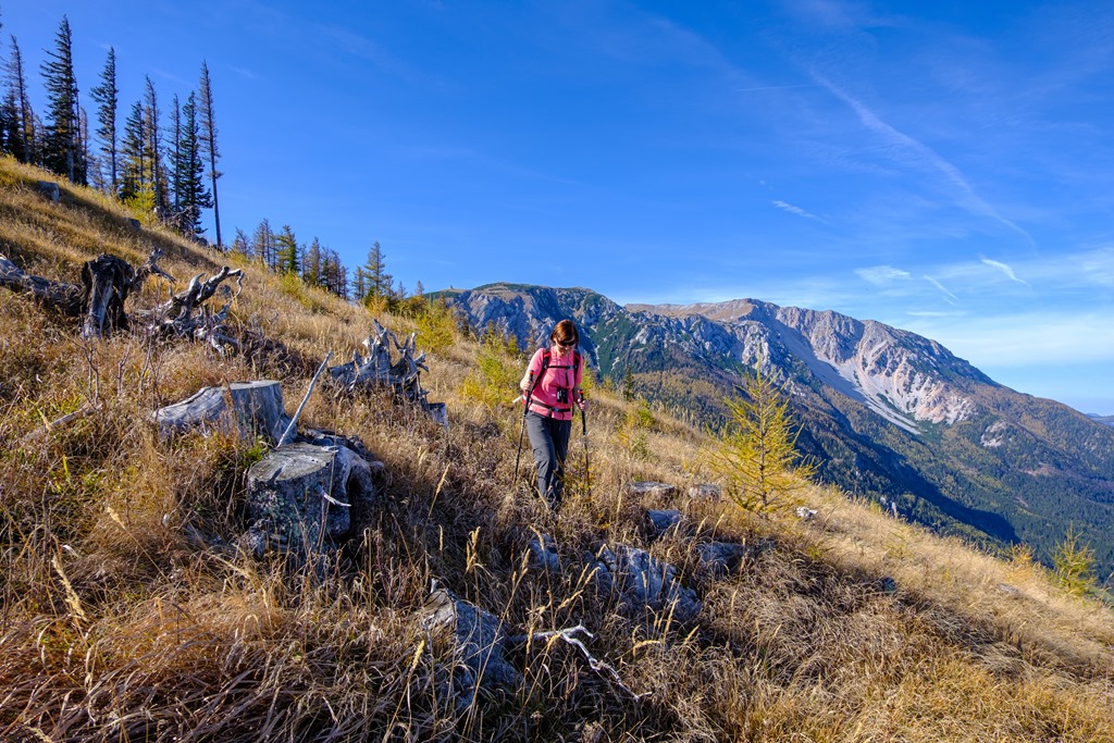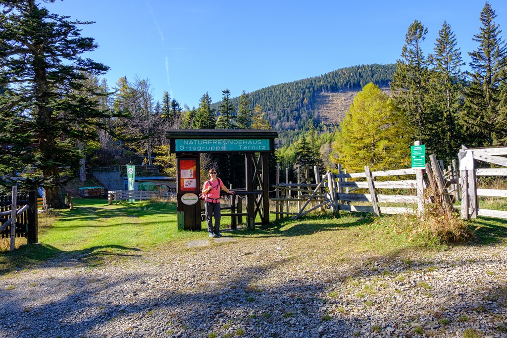 A kisvonatos taktikai húzás tökéletes siker, Angika mindenféle gond nélkül abszolválja az így reá kirótt kaptatókat. Az első szakaszon, a Ternitzerhütteig, széles erdészeti úton, gyengéd emelkedőn poroszkálunk. Szél nem lebben, az őszi nap a legszebb, aranyszínű arcát mutatja. Öröm a künnlét minden perce.
