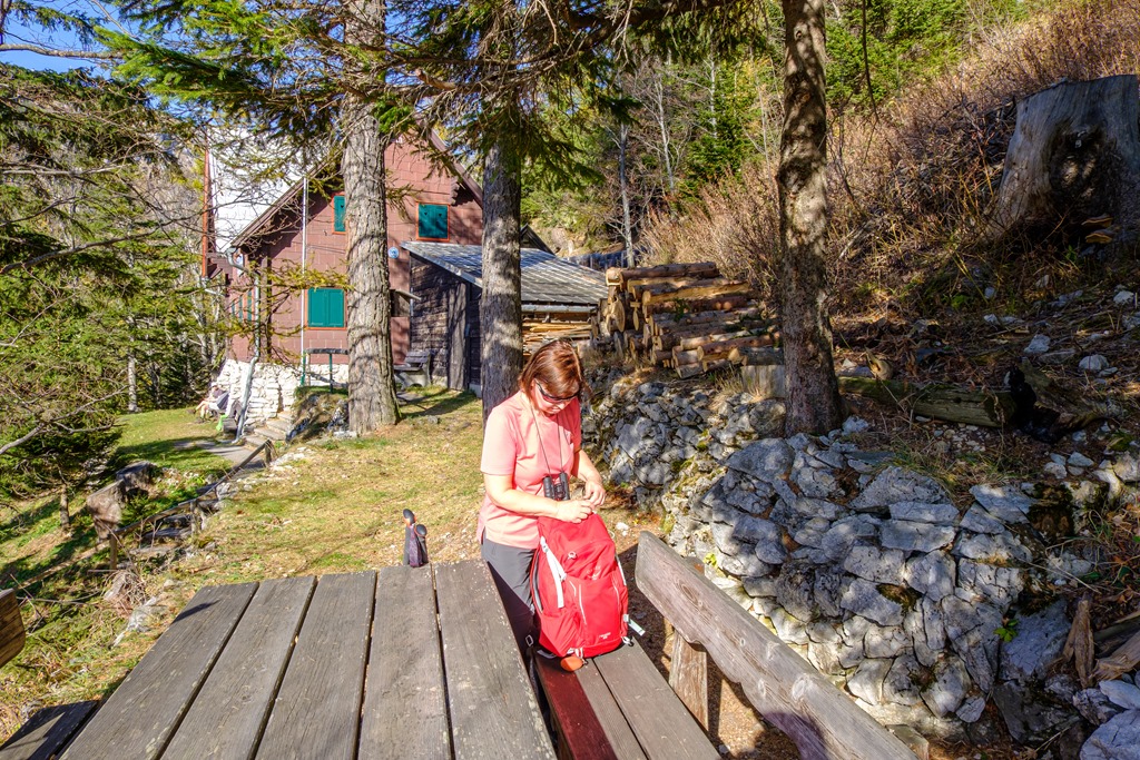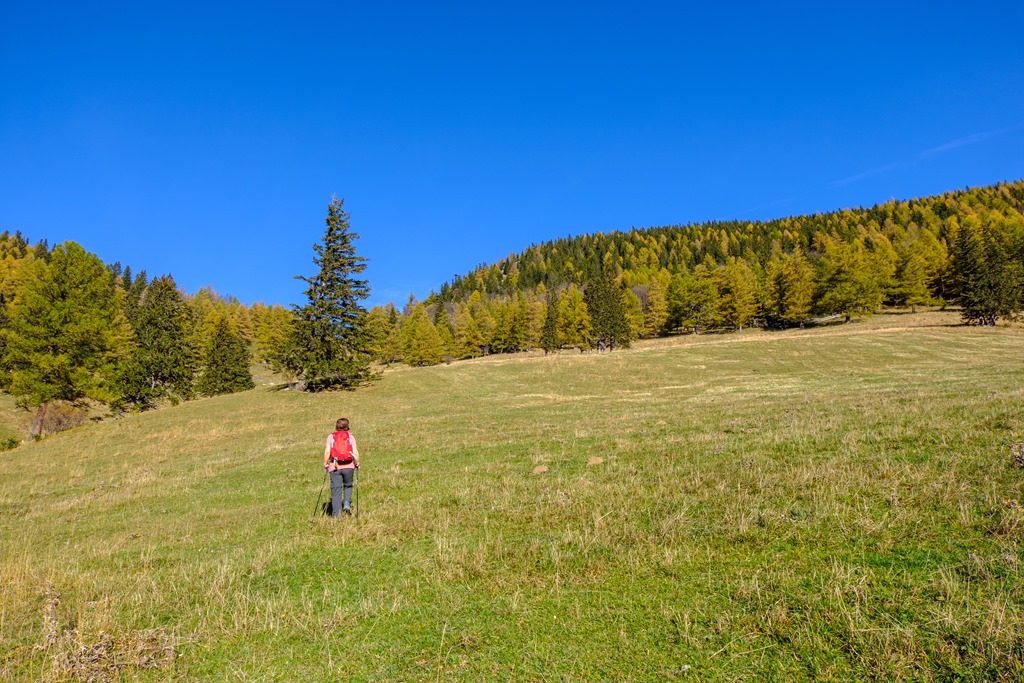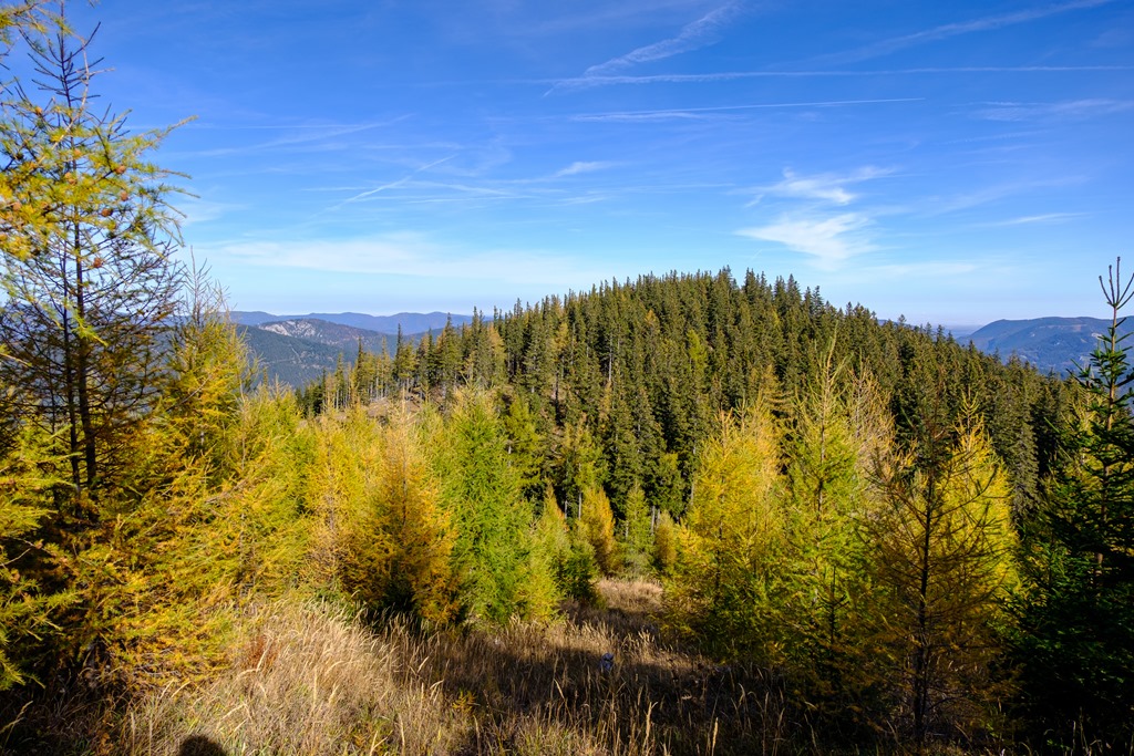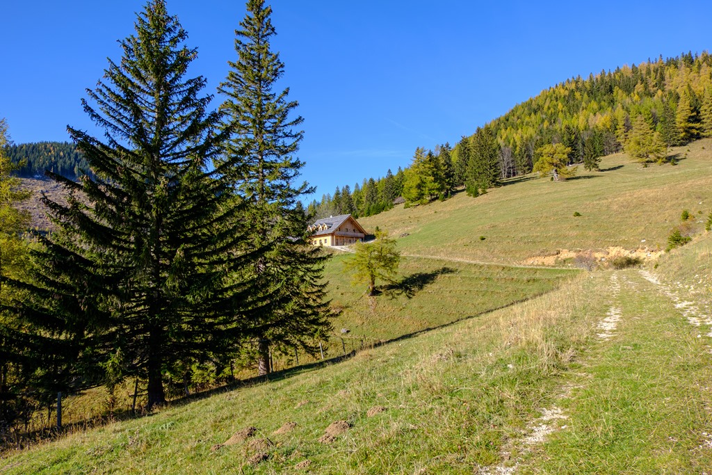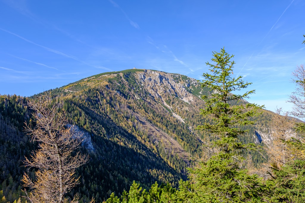 A kisvonatos taktikai húzás tökéletes siker, Angika mindenféle gond nélkül abszolválja az így reá kirótt kaptatókat. Az első szakaszon, a Ternitzerhütteig, széles erdészeti úton, gyengéd emelkedőn poroszkálunk. Szél nem lebben, az őszi nap a legszebb, aranyszínű arcát mutatja. Öröm a künnlét minden perce.