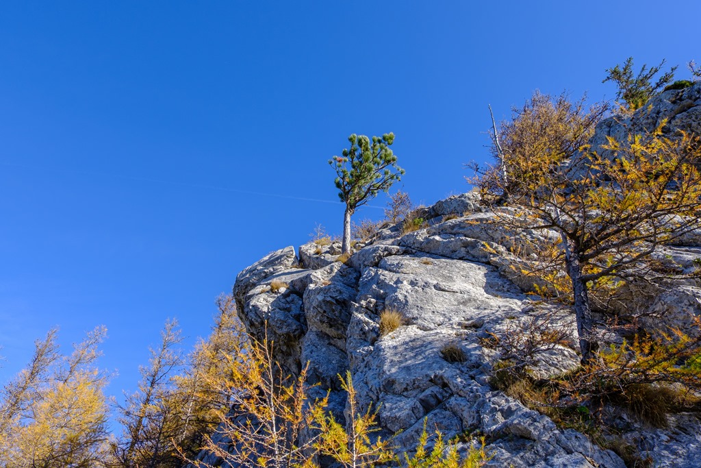 A jelöletlen út meredek szerpentinekben tör felfelé, majd egy traverz jön nyugati irányban a Schneeberg tömbje felé. Az ösvény aztán áttör egy sziklalépcsőn (lenti kép), majd jobbra fordul élesen és folytatja a kanyargást a plató felé. Alig negyed óra alatt érünk ki egy erdészeti útra a Hengst tetején.