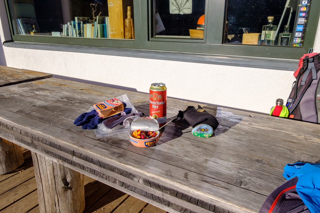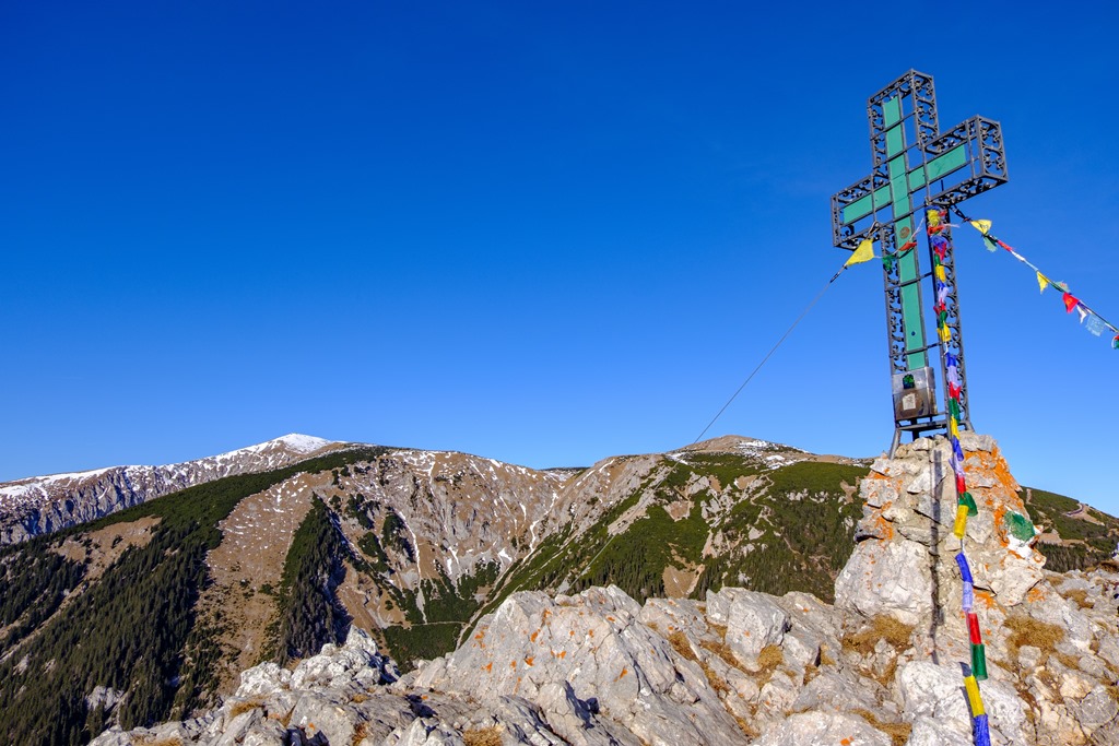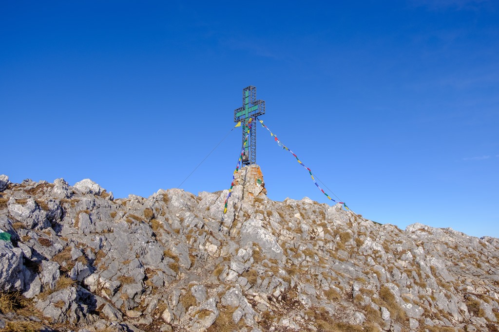 Indulástól számítva szinte pontosan 3 óra alatt érkezem a csúcskereszthez (fenti képek). Készítek néhány felvételt, majd lehuppanok egy sziklára és kiiszom egyik kulacsomat. Még maradnék, de rövid a nap és a Knofelebenen tervezek egy hosszabb pihenőt. A kunyhó napos teraszán ideális körülmények között költhetem majd el elemózsiámat. Uzsgyi tehát lefelé.