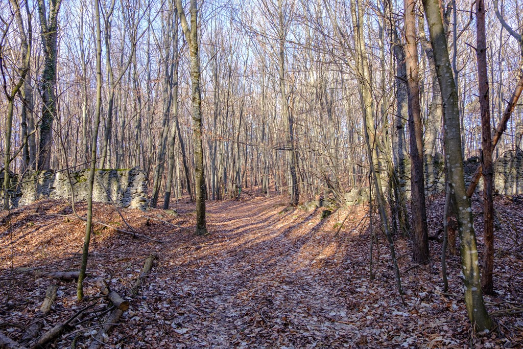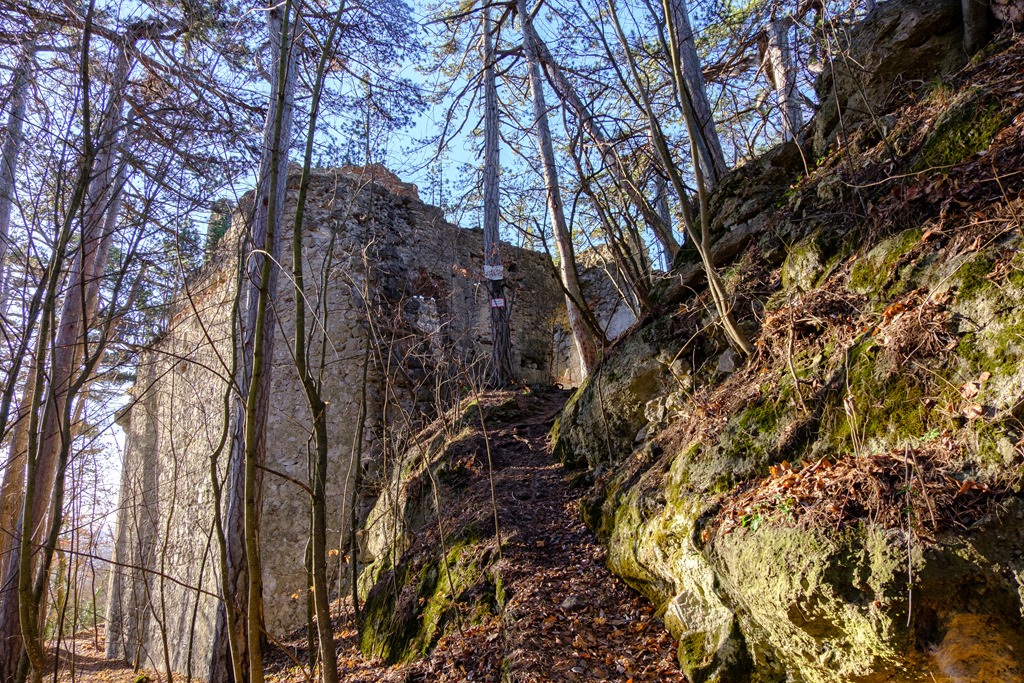 Hogy ne legyen unalmas, most a hegy, ritkábban járt déli-délnyugati oldaláról közelítem az Esisernes Tort. A rendes turistaút itt elhúz csendesen Merkenstein romjai alatt. Ha viszont a térképet kicsit jobban megvizsgálom, akkor kiderül, hogy a vár körül létezik egy ösvény, mely alkalmasnak látszik felfedni a várrom számomra még ismeretlen oldalát.