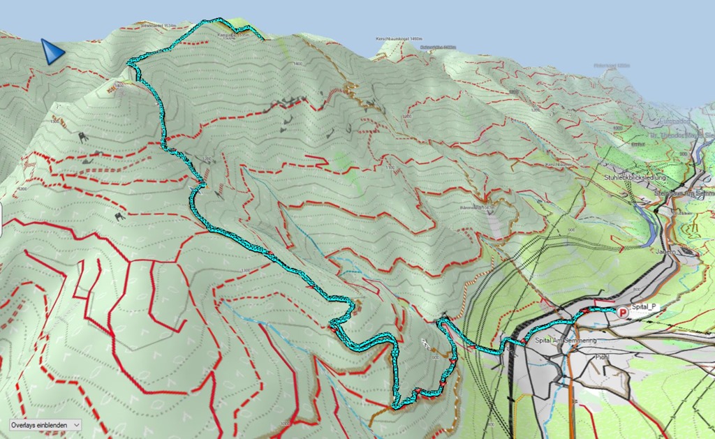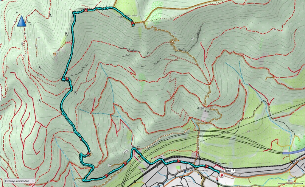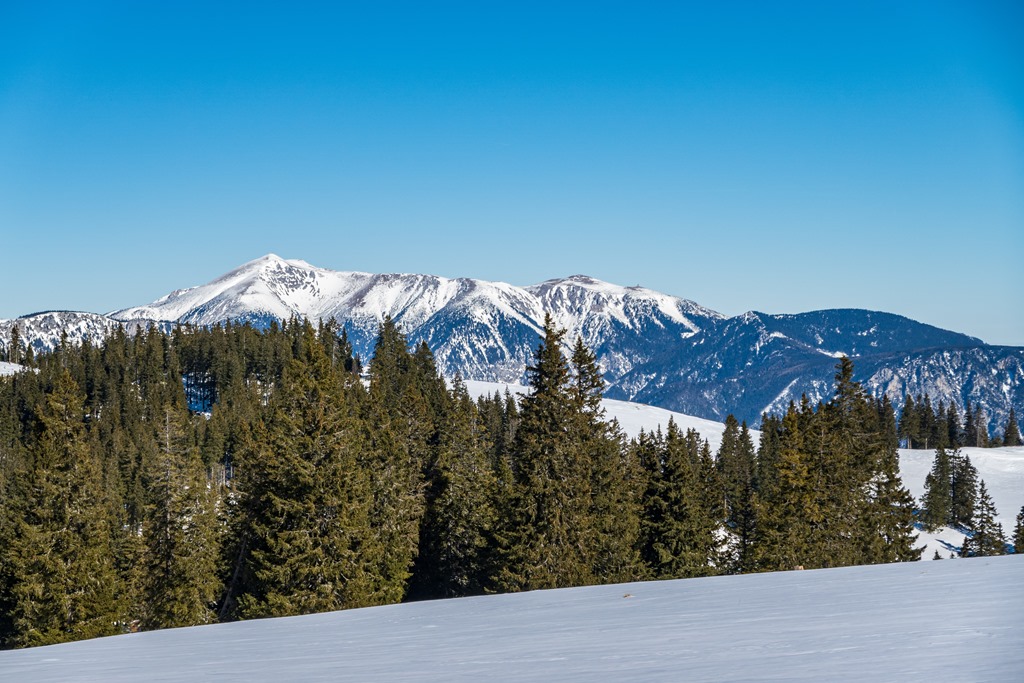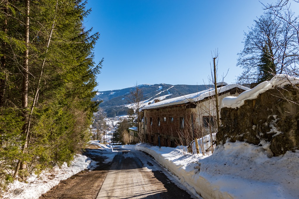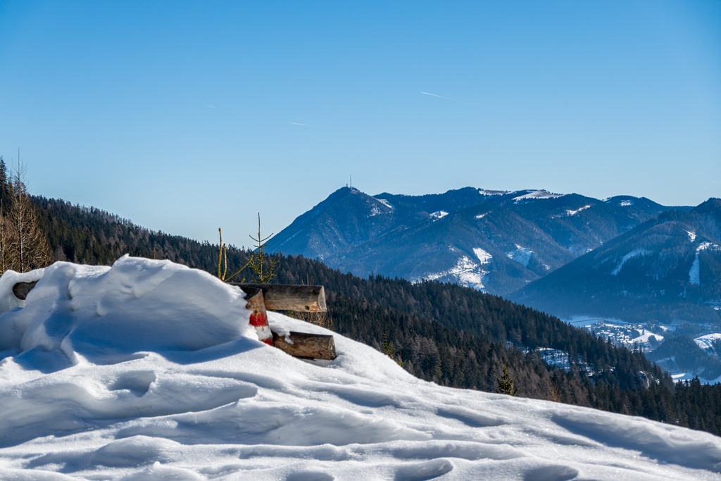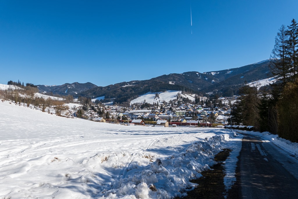 A Stuhleck sípálya legalsó szinten levő parkolójából indulok. Átvágok Spitalon, gyenge emelkedőn az állomáshoz érek, ahol egy alagút átvisz a sínpálya (a híres Semmering vasút, fenti képen) túlsó oldalára. Az út még jeges, de a nap már melengetően ragyog. Szél nem lebben, tökéletes téli túra időnek néz ki a mai nap.