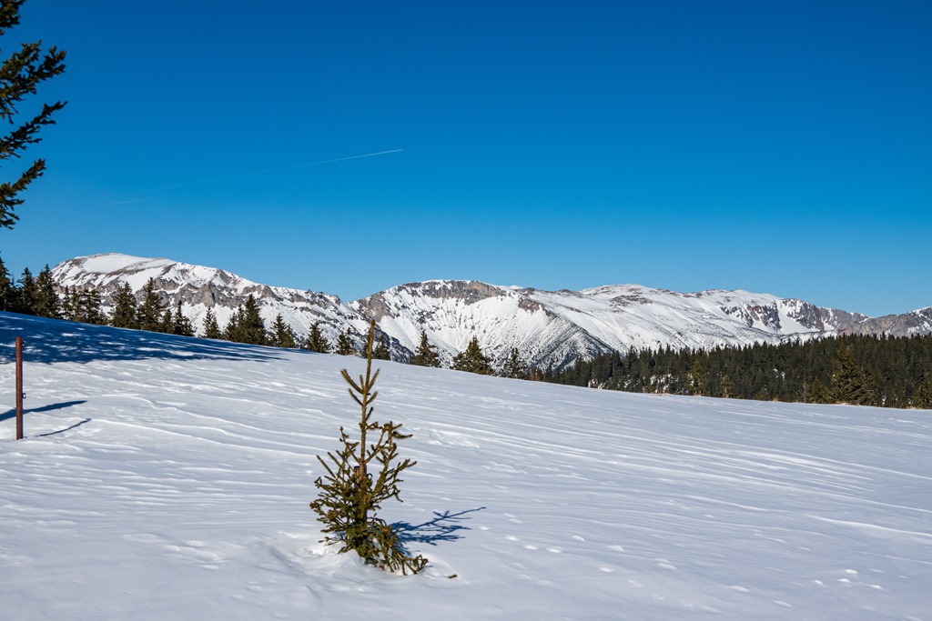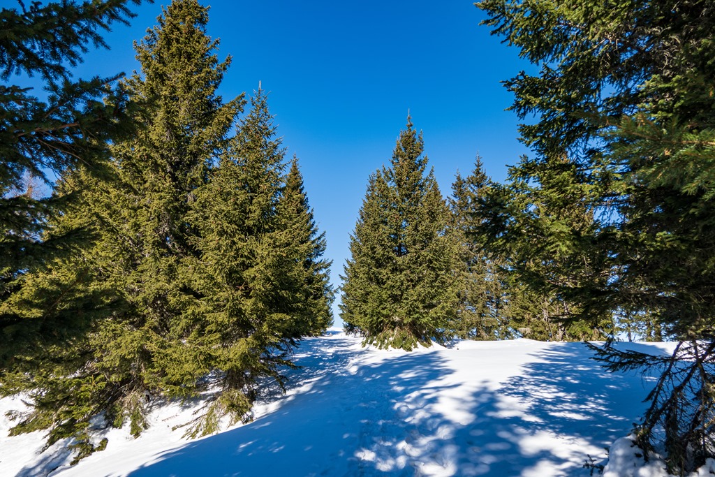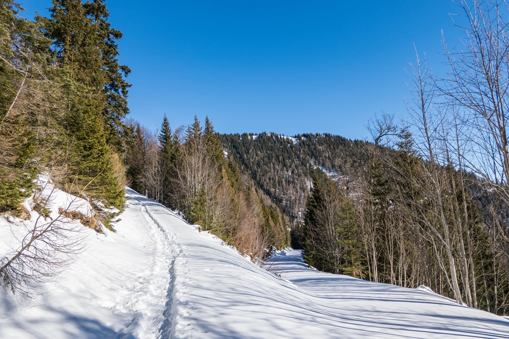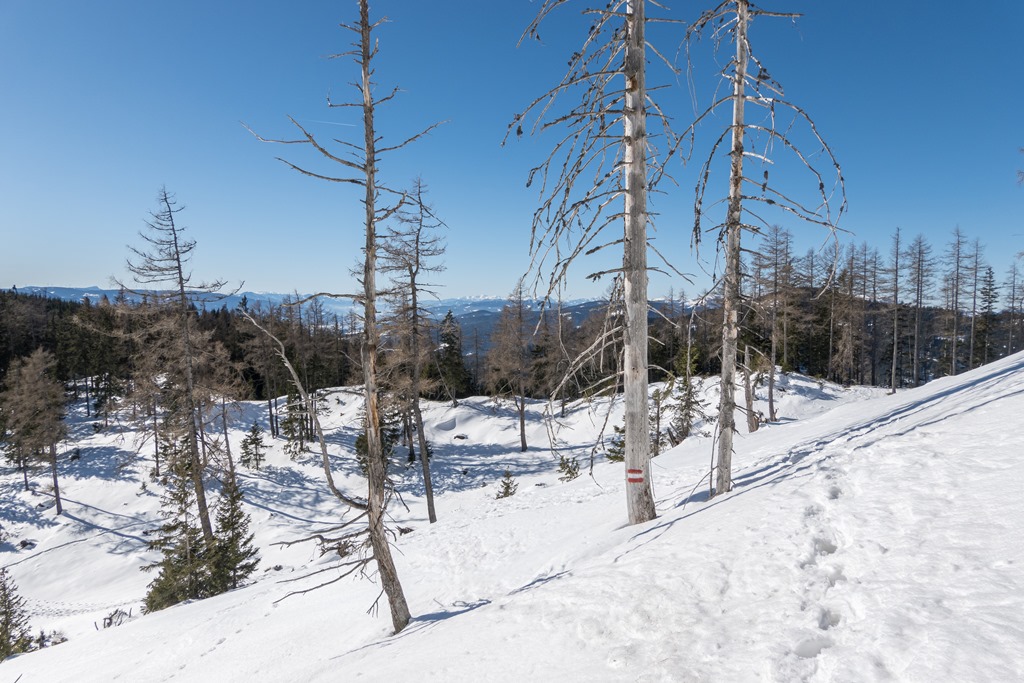 Elhagyom a hótól tisztított utakat és kisvártatva benn találom magam az erdőben. Az erdészeti utat vastagon takarja a fagyos hó. Hótalpaim eleinte csak hágóvas-módozatban tesznek szolgálatot. Feljebb aztán már a beszakadást is meggátolják. Olyan melegen süt a nap, hogy legszívesebben rövidujjúra és rövidnadrágra váltanék. Izzasztó!