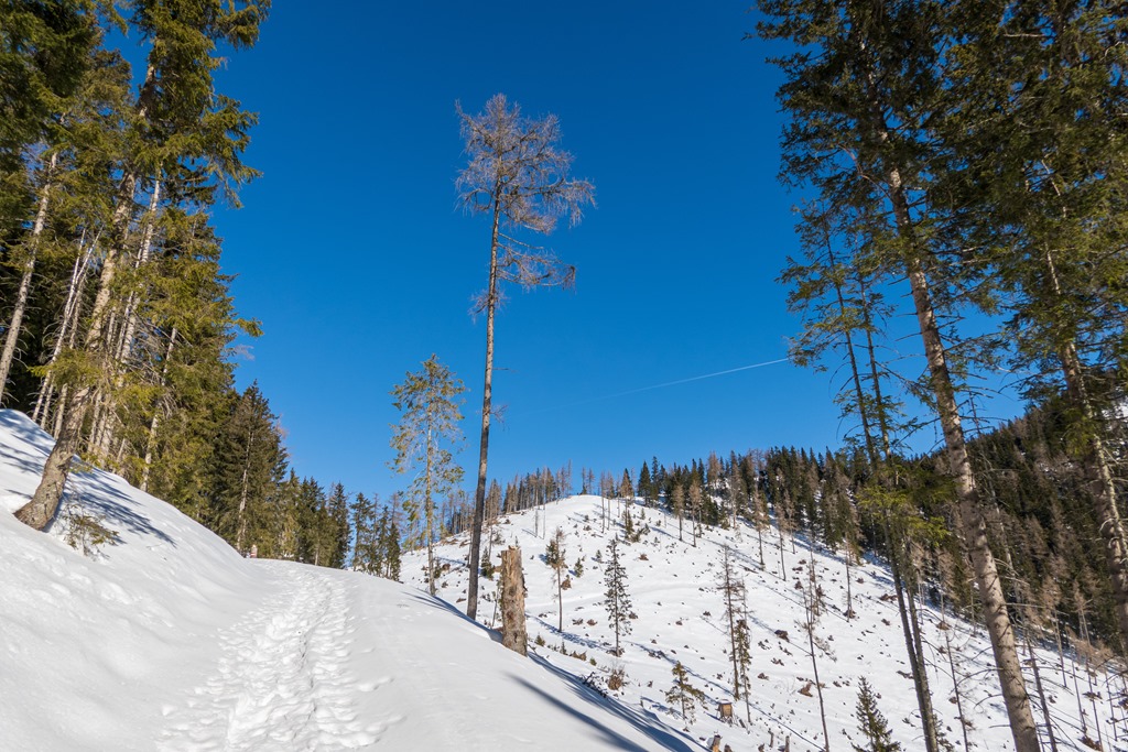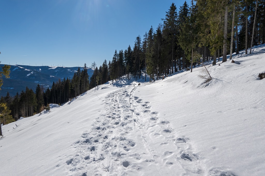 Nyolc év telt el azóta, hogy így télen, utoljára jártam, a Kapalpen (1535m). Éppen ideje van tehát egy frissítésnek. Akkori beszámolómban idéztem Thomas Rambausket, ami magyarázatot ad a jelen címre (antitézis). Tökéletes jellemzés. Bár van kitaposott utam, de egyetlen lélekkel sem találkozom. Magányom a vadonban, a mai napon, tökéletes.