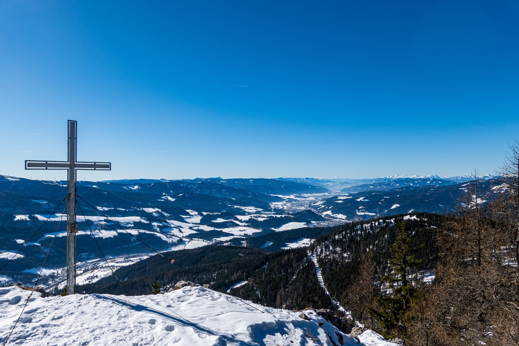 Cirka 2:20 óra alatt érem el a Kampalpe csúcsát. A kereszt valamivel odébb és lejjebb van egy szirten (fenti képeken). Nyilván azért tették oda, mert tán innen nyílik a legjobb kilátás a távoli havas hegyekre. Jobbkéz felé pillantva a szirtről, látszik a Gesäuseberge és Eisenerz, valamint a Hochschwab és a Veitschalpe (balról jobbra haladva a tekintettel). A túlsó oldalon a Rax és a Schneeberg trónol.