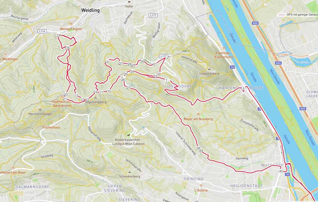 Az útvonal: Eisernehand-Gasse, Kahlenberg, Südtiroler-Trail, Südtiroler-Tral alsó harmada még egyszer, Dornröschen-Trail, Kahlenberg… (960 m szintemelkedés)