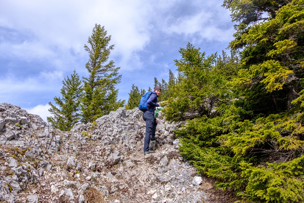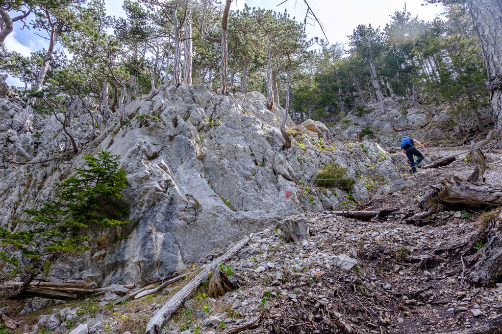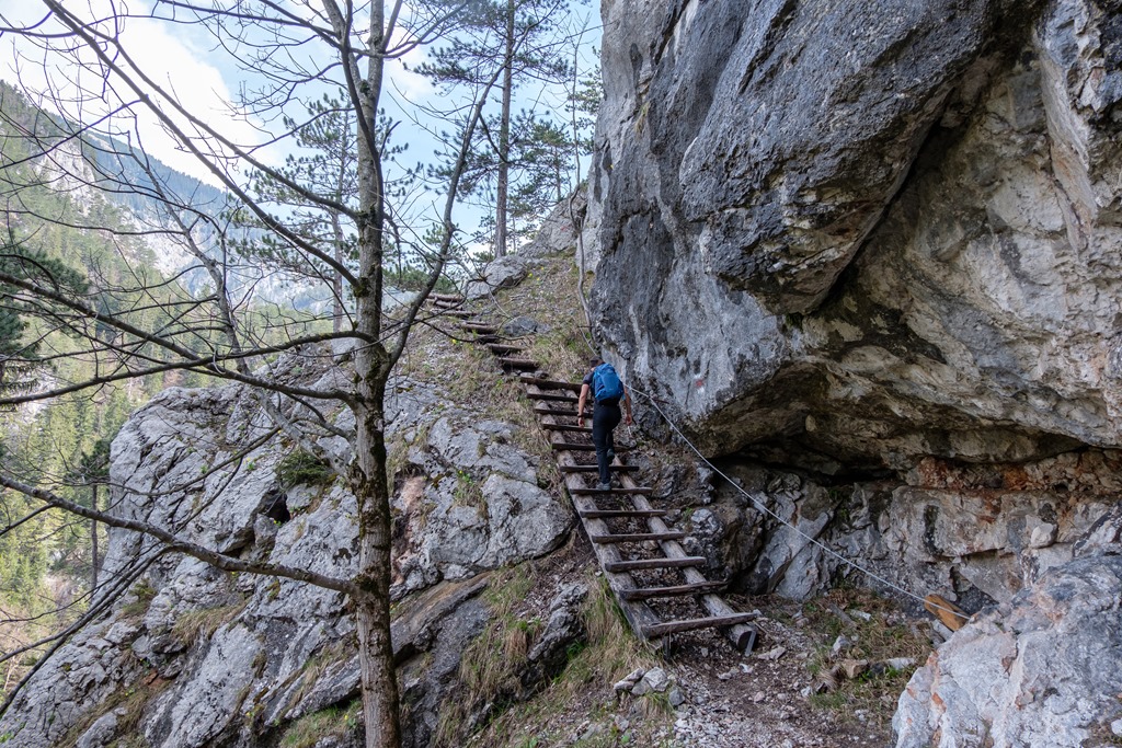 Jó tempóban vesszük a Miesleitensteiget (fenti és lenti képeken), mely egy ideig enyhén emelkedik majd a kulcspontban egy törmelékes hegyháton keresi szerpentinekben az utat. Az itt kínálkozó drótköteles biztosításokat érdemes helyenként elfogadni (lenti képek).