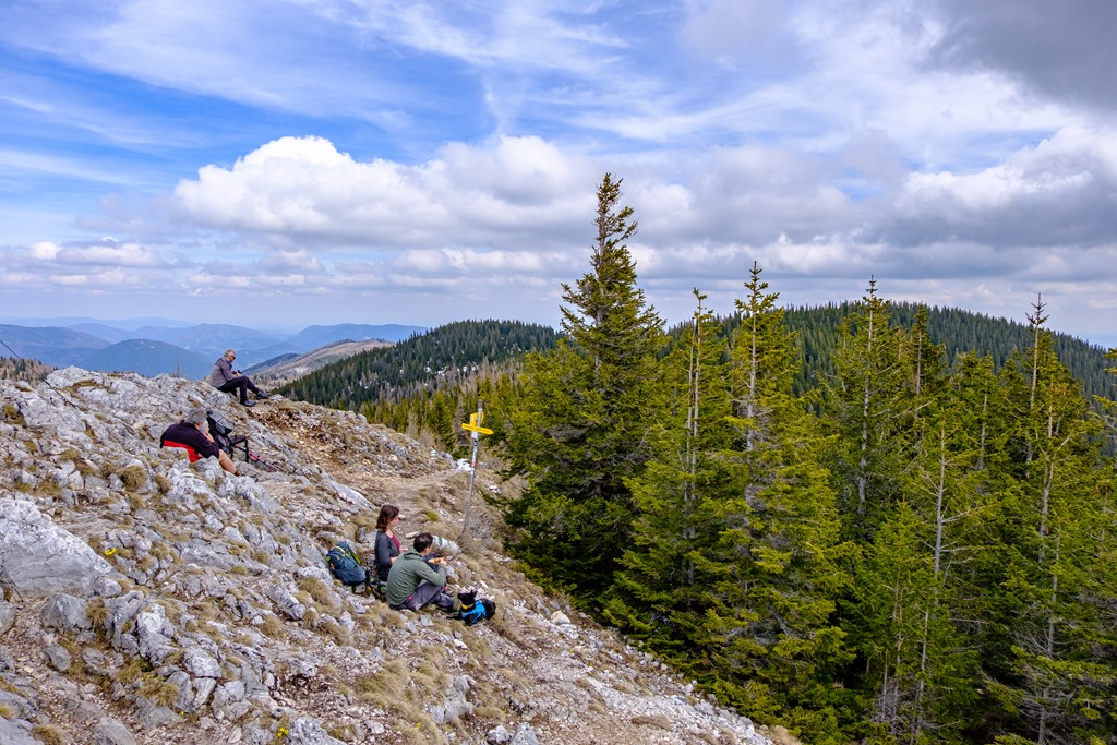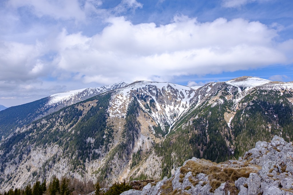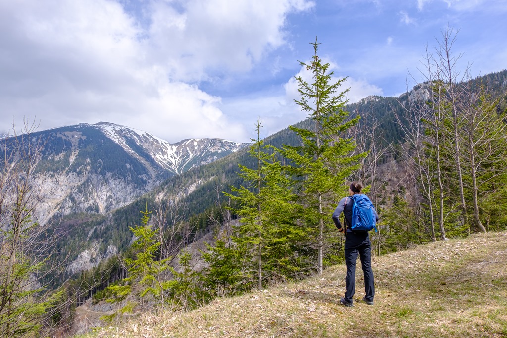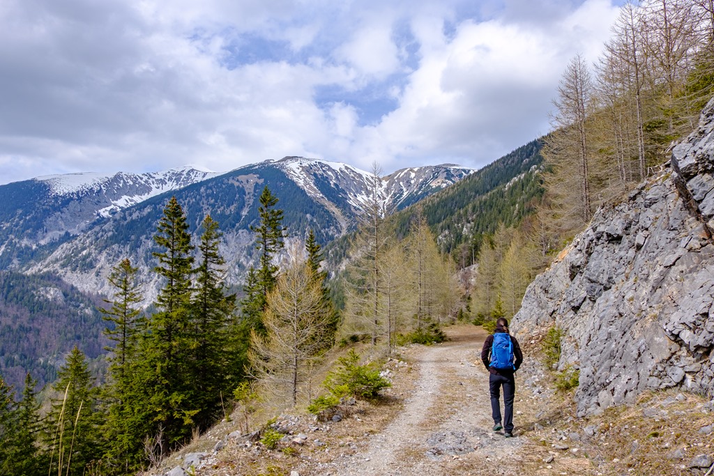 Másfél óra után érünk ki egy széles, elhagyatott erdészeti útra, mely hajtűkanyarokban dolgozza egyre feljebb magát. Ez itt, valószínűleg Alsó-Ausztria hegyvilága legelhagyatottabb de egyben a hegyek panorámájának leginkább kitett része (lenti képek). Gyakorlatilag egy katlan, minden oldalról valamely hegység vonulatával körbe kerítve.
