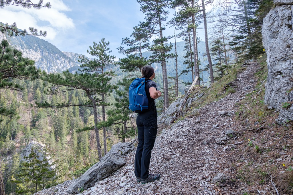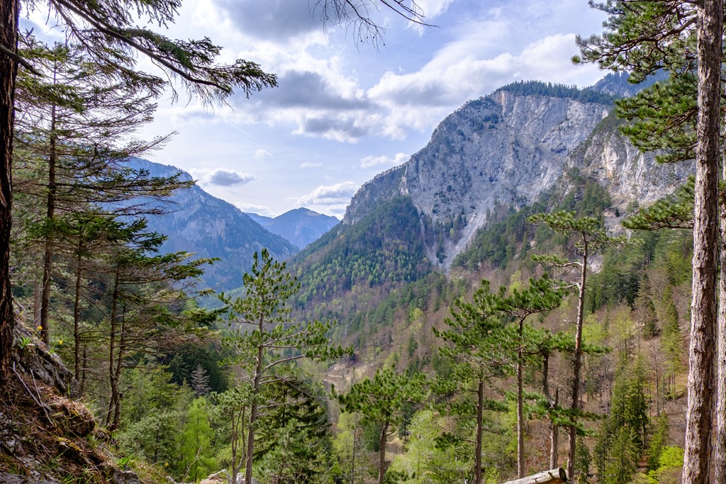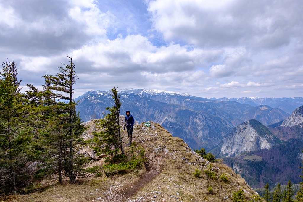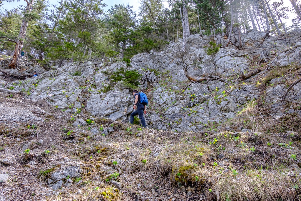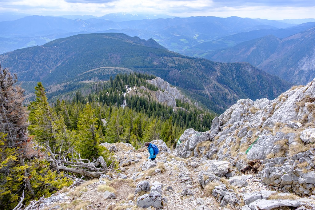 Másfél óra után érünk ki egy széles, elhagyatott erdészeti útra, mely hajtűkanyarokban dolgozza egyre feljebb magát. Ez itt, valószínűleg Alsó-Ausztria hegyvilága legelhagyatottabb de egyben a hegyek panorámájának leginkább kitett része (lenti képek). Gyakorlatilag egy katlan, minden oldalról valamely hegység vonulatával körbe kerítve.