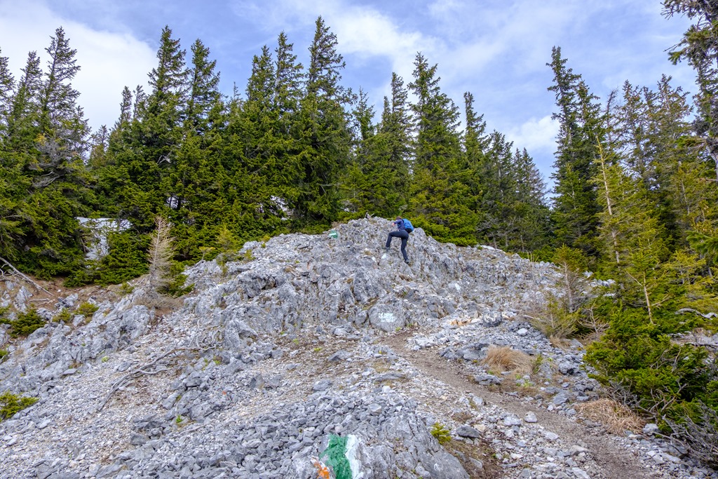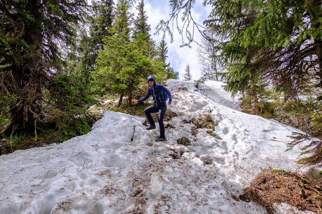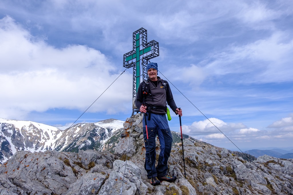 Menetrendszerűen, szinte egészen pontosan két óra elteltével érkezünk a Knofelebenre, az itt található modern kunyhó tövébe. Nem időzünk, hanem folyamatos, sietős léptekkel máris az út utolsó, legmeredekebb harmadára vetjük magunkat. Itt-ott, olvadozó, kásás hómezőkön átgázolva, a Krummbachstein déli előcsúcsán át egy nyeregbe, majd itt-ott mászást mímelve fel a csúcskereszthez. Ez a mutatvány is az elvárásokkal egyetemben pontosan egy óráig tartott, azaz indulástól számítva 3 óra alatt érkezünk célunkba, miközben 1130 m szintemelkedést gyűrünk le.
