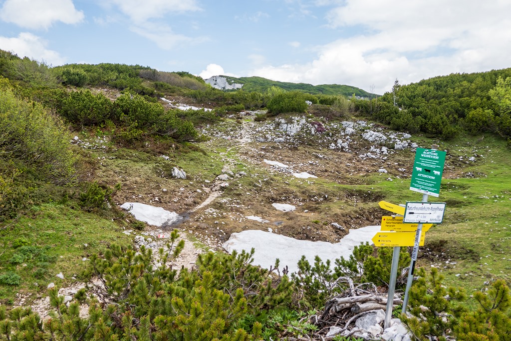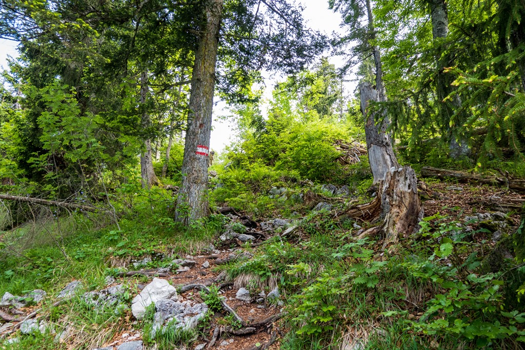 A 960 méteren fekvő nyeregből, a Tressensattelból, a valamikori Trisselblick vendégfogadó elől indulok (fenti képen). Egy sárga tábla útmutatására hagyatkozom, mely a célom felé terelget, mégpedig eleinte egy elég gyengén kivehető ösvényen. Később aztán, az út folytatása mindvégig jól követhető nyomon marad.