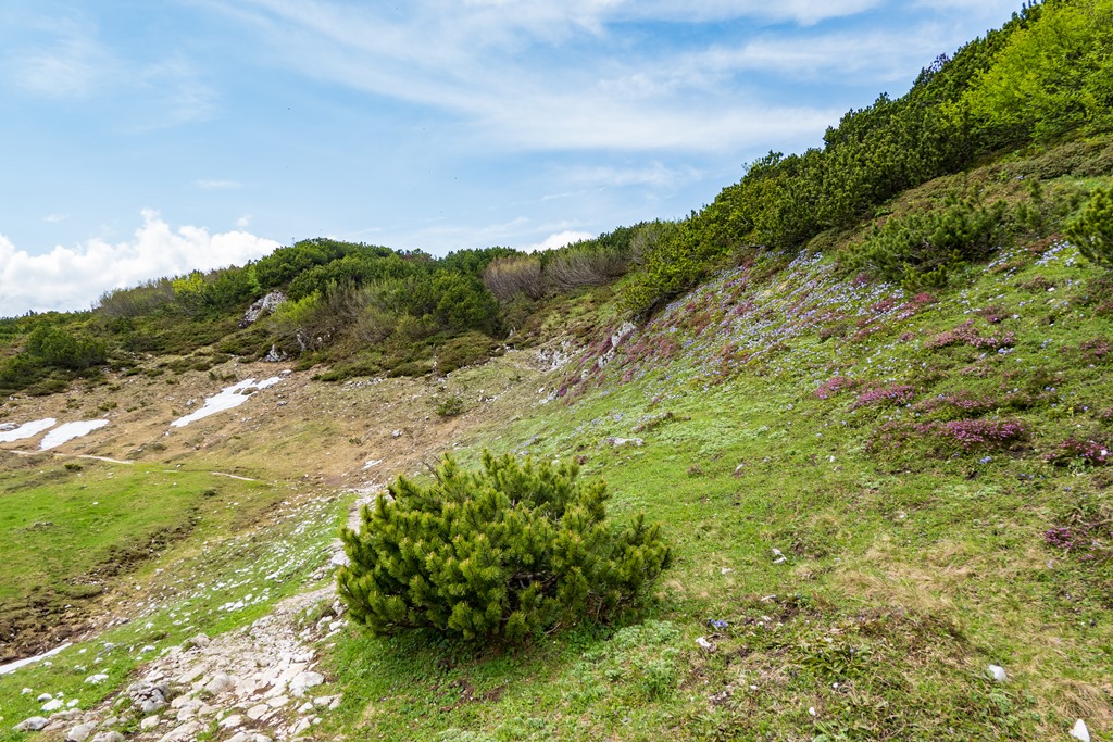 Először sötét fenyőerdőben kaptatok. Kissé meg vagyok illetődve, mert már régen jártam teljesen új, még fel nem derített terepen. Egyedül vagyok, eleinte a magányom tökéletes. Később aztán mind fel, mind pedig lefelé menetben több túrázóval is találkozom.