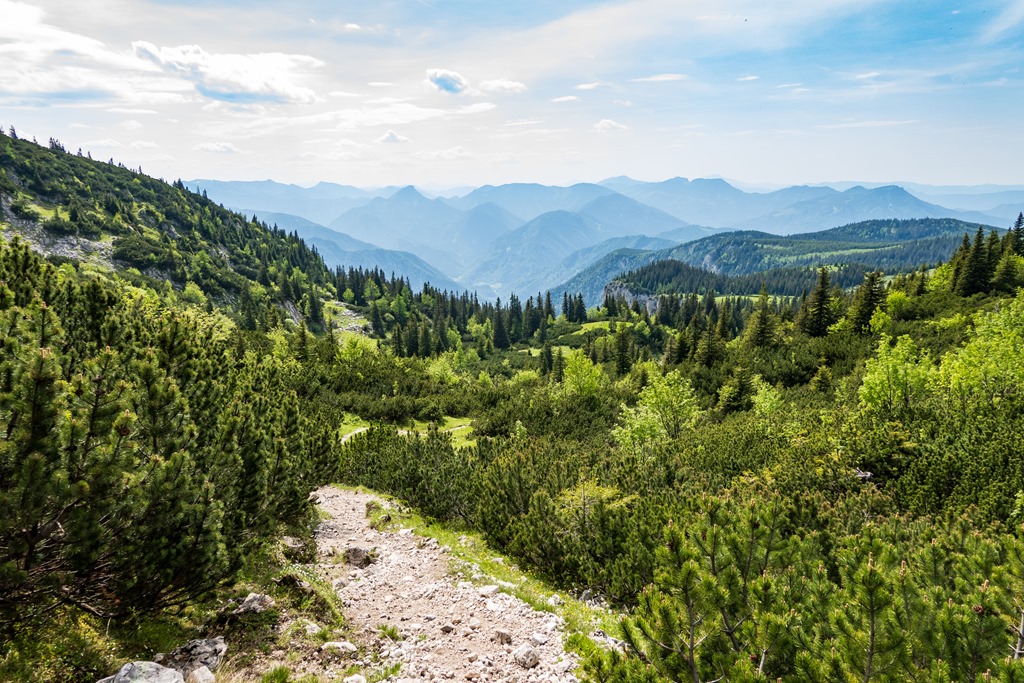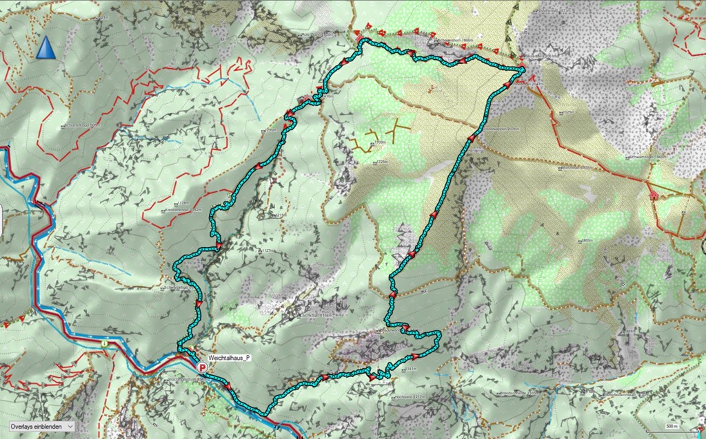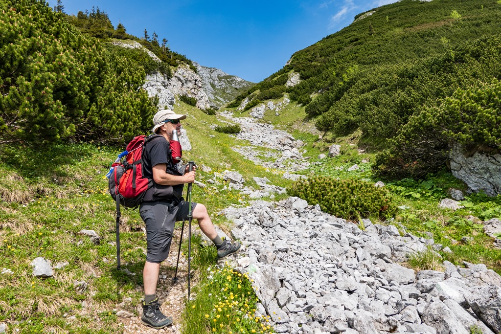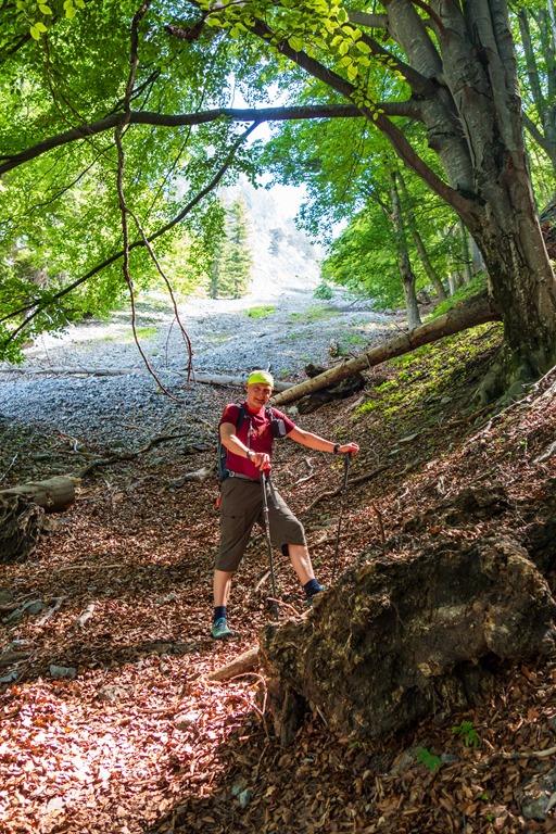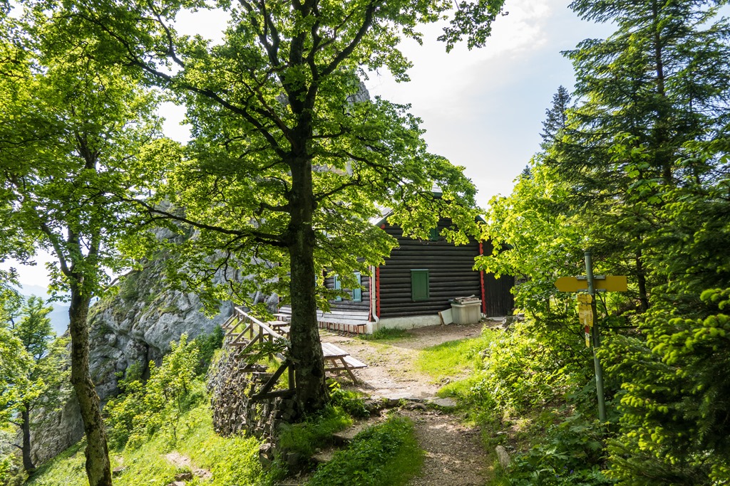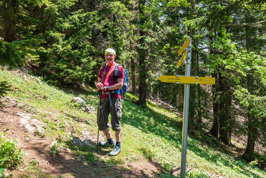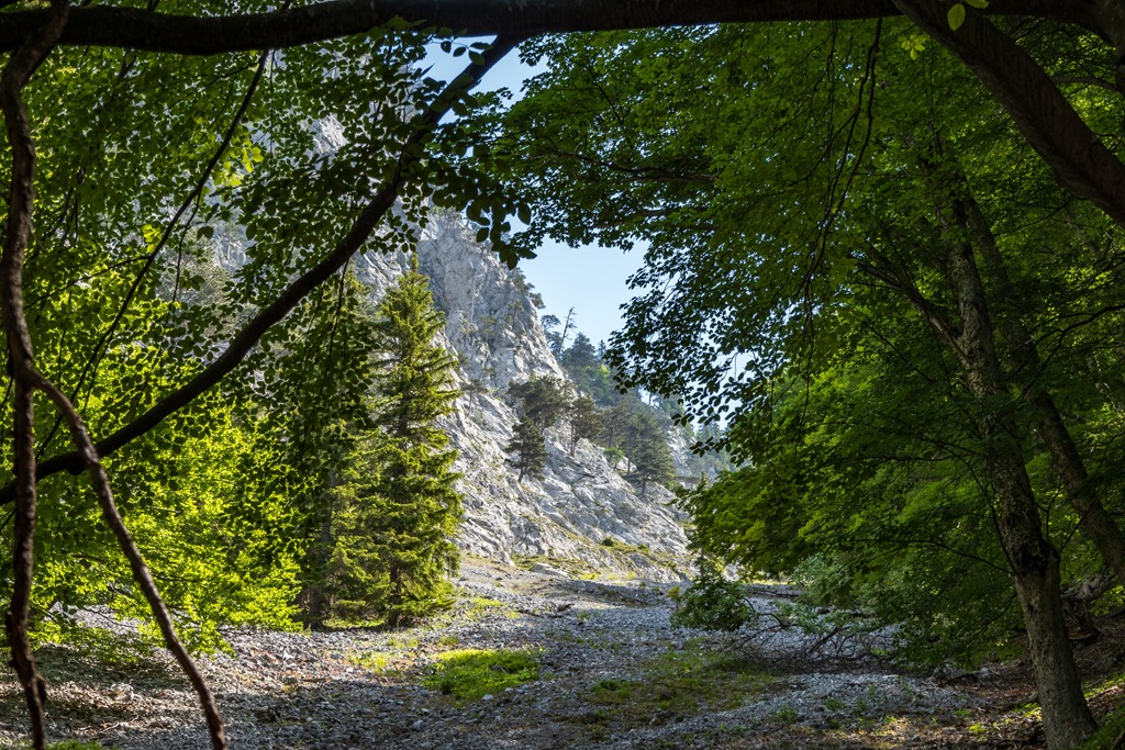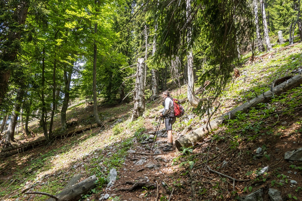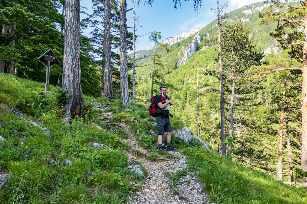 Fél tíz után valamennyivel indulunk a Weichtalház melletti nagy parkolóból, mely hétfő lévén majdnem üres (amin csodálkozni nem lehet). Először az aszfaltúton a Stadelwangraben bejáratához, majd áldásosan árnyékos erdőben folyamatos kaptatásban felfelé. Az út bár hivatalosan nem jelzett, mégis remekül követhető. Odafigyelés azért elkel, ugyanis balra, a falak felé, ágaznak le sziklamászók által használt ösvények. Kétséges esetben, jobbra tarts, az aranyszabály.
