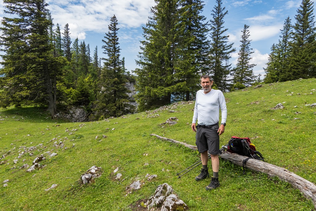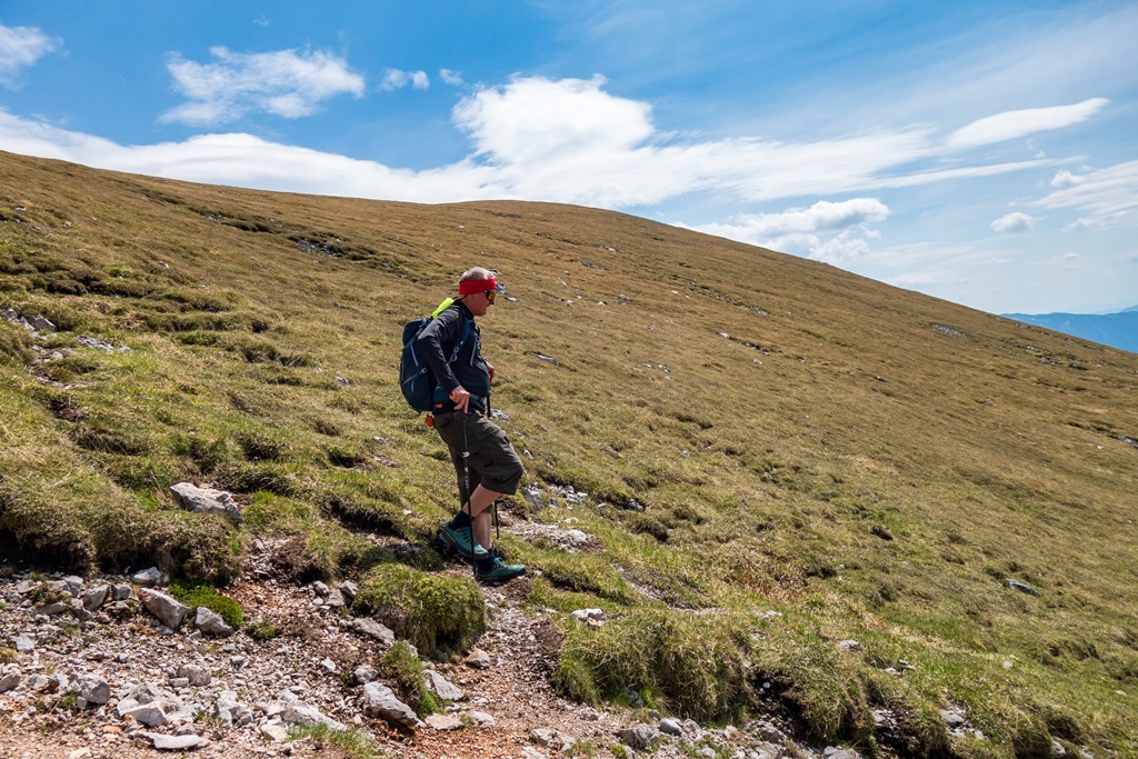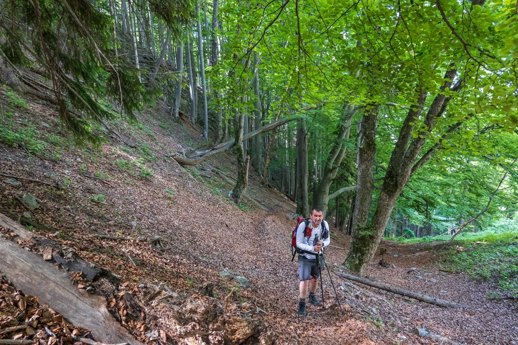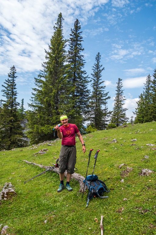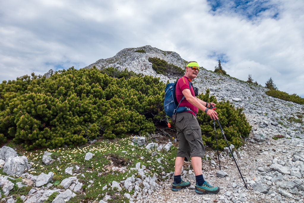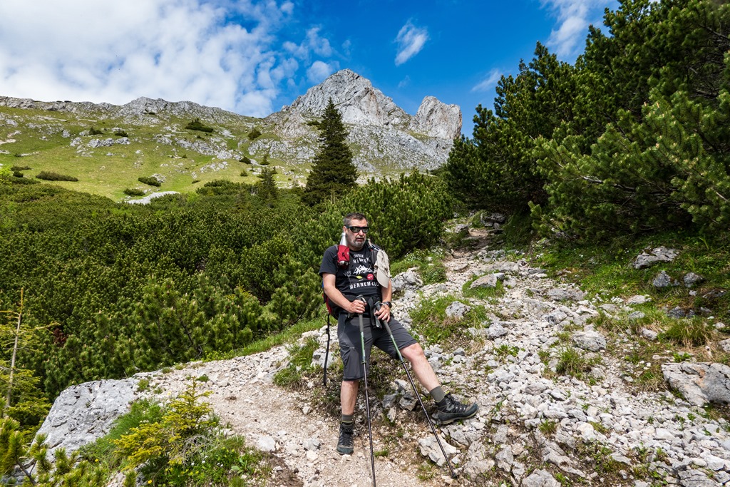 A Mesemező felett cirka 10 percnyire, rálelünk a Grafensteig vonalára, majd követjük az immár jelölt turistautat, valóban nyílegyenesen a csúcs felé. Hamarosan magunk mögött hagyjuk az erdőt és törpefenyők formálta fülledt utcácskában küzdjük magunkat egyre feljebb. A következőkben sziklás terepre jutunk és belénk kap a meteorológusok szerinti északnyugati szél, mely itt azonban egyenesen déli irányból, azaz hátulról csap le ránk. Nocsak, ni! Közben az ég sem éppen vidámkodik. Egy helyen a törpefenyők fala úgy tűnik elzárja a továbbjutás lehetőségét, és mint már korábbi alkalmak esetén is, keresgélni kell azt a szűk és alig-alig látható kis átjárót, mely utat nyit.