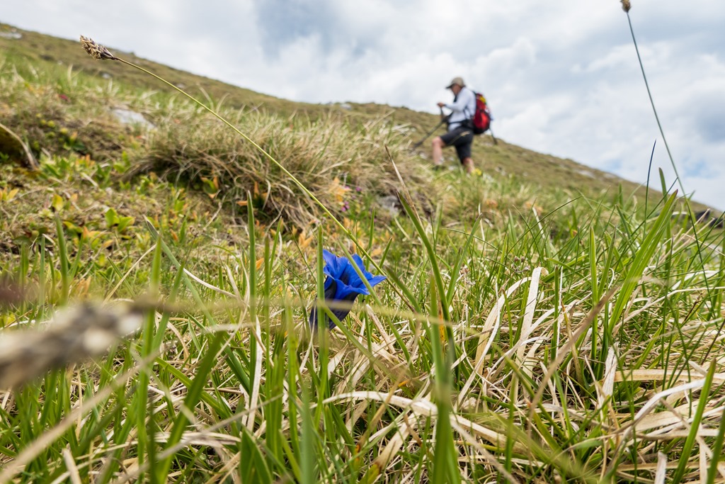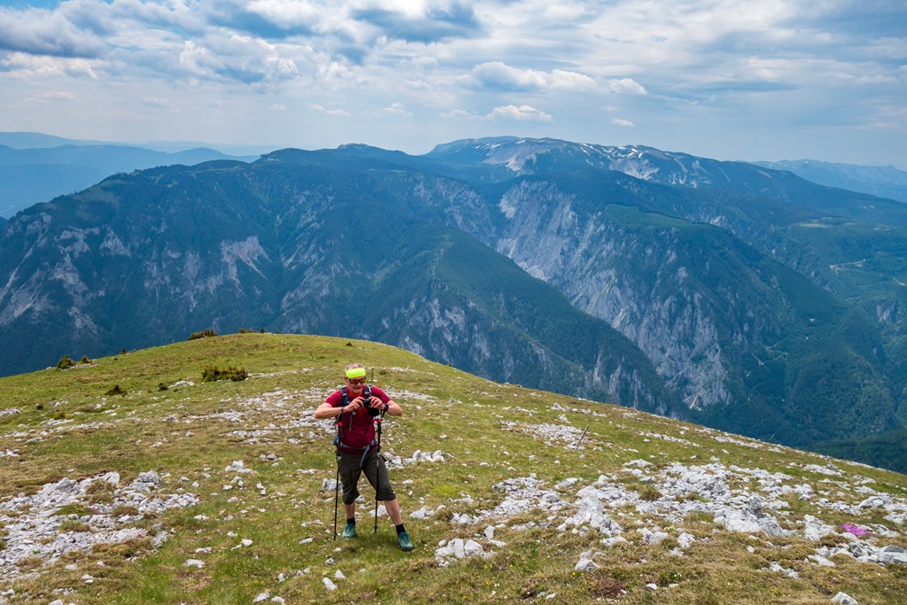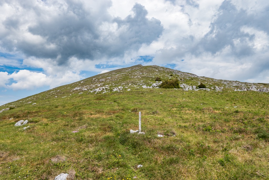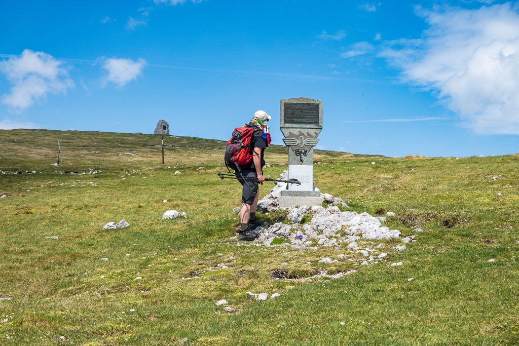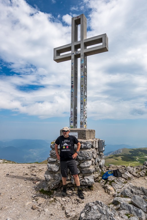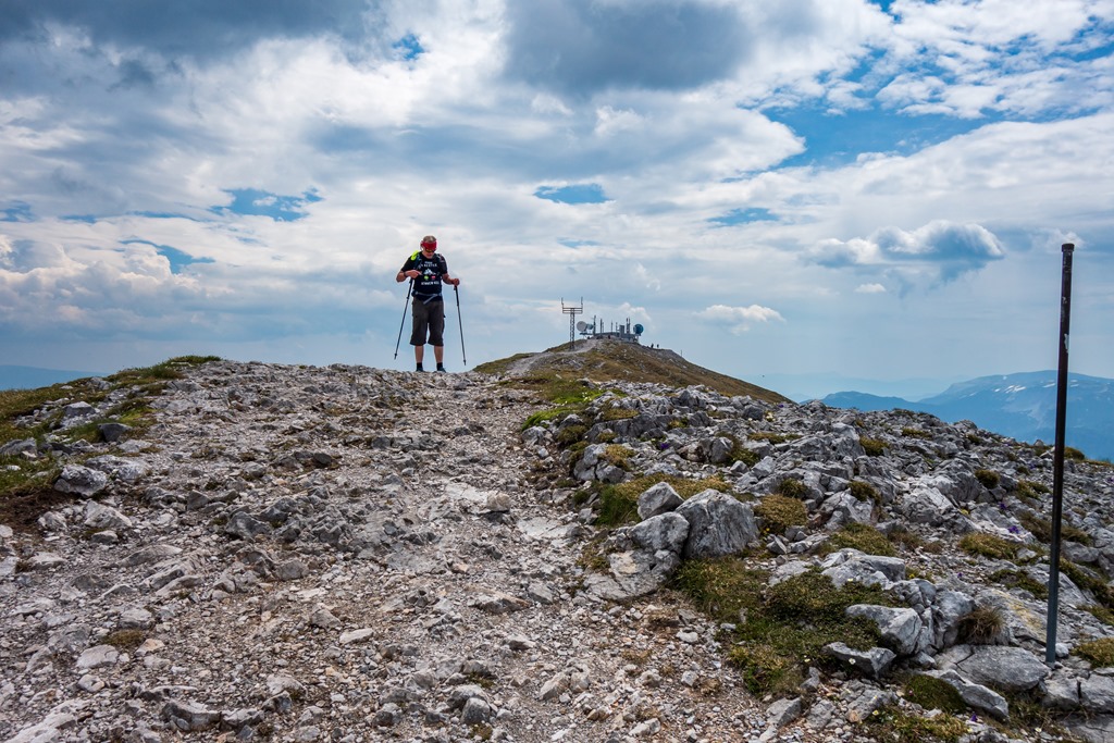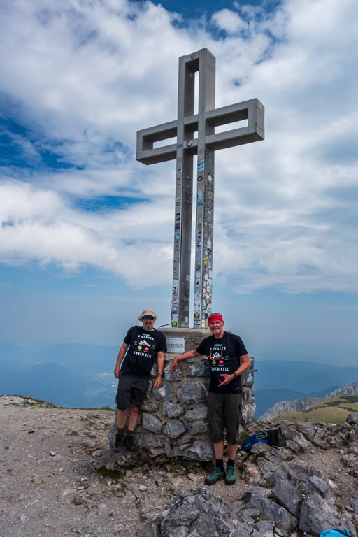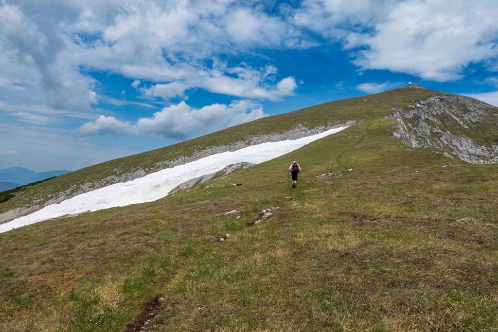 A sziklás terepen túl egy hosszú füves hegyháton araszolgatunk tovább, mely nyúlik mint a rétestészta. Egy helyen, a csúcson található radarállomásra pillantva, megsaccolom az eléréséhez szükséges időt, kb. 15 perc. Na lássuk a medvét! Nekiveselkedünk tehát az utolsó menetnek, amiből egy igazi csúcsostrom kerekedi. Tudniillik 5 perc elteltével rápillantok az órámra, és bejelentem hangosan, hogy „10 perc”, Aztán három perc elteltével, hogy „7 perc”, majd percenkéti visszaszámlálás következik. És íme, mit ad Isten, mire nullát kellene kiáltanom, fenn is vagyunk a radarok tövében, igaz még vagy 10 lépés a kereszt, de megcsináltuk. Bruttó, majdnem percre pontosan négy óra a menetidőnk a Klosterwappenig.