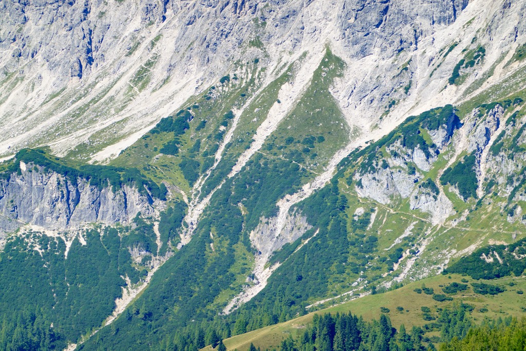 A Linzersteig jól látható vonala, ahogy az odafennről húzódó árkokat keresztezi. Közelítésben a Rötelsteinröl fotózva.