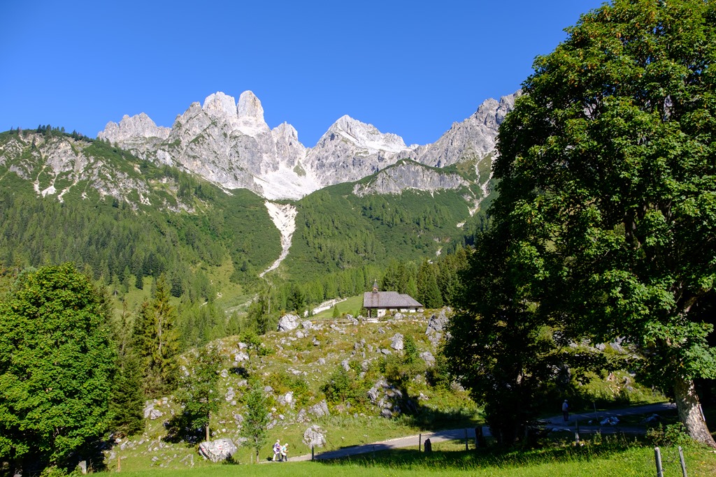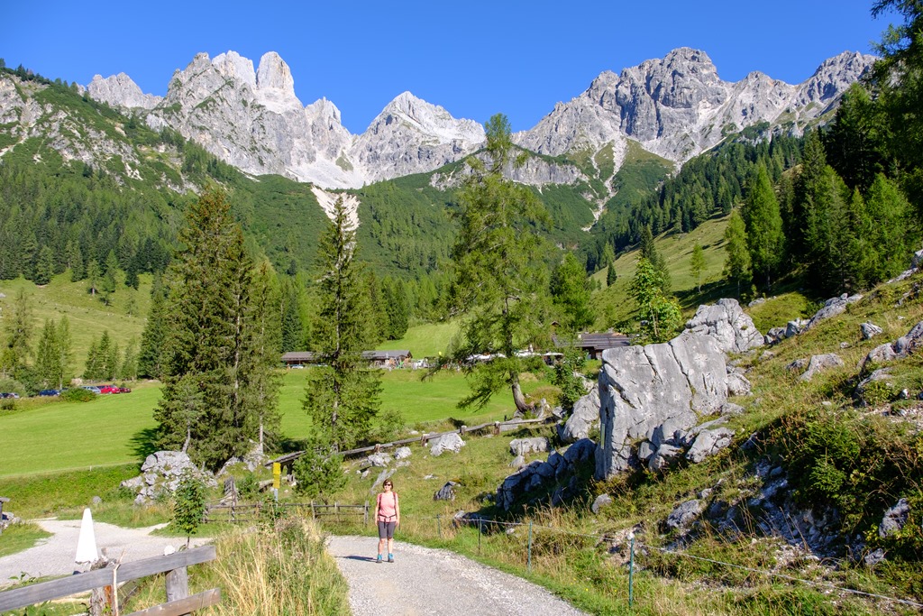 A Püspöksüveg (Bischofsmütze; 2458m), formája miatt, a nyugati Dachstein egyik jellegzetessége, híressége, mindenki látni szeretné. Természetesen mi is. Ennek legjobb módja, egyszerűen csak meglátogatni a Hofalmokat, mégpedig az Unterhofalmot (ami feljebb van) és az Oberhofalmot. Egy fizetős alpesi út visz fel az Almok alatti parkolóba. Egy csodás, széles völgykatlan nyílik ki előttünk.