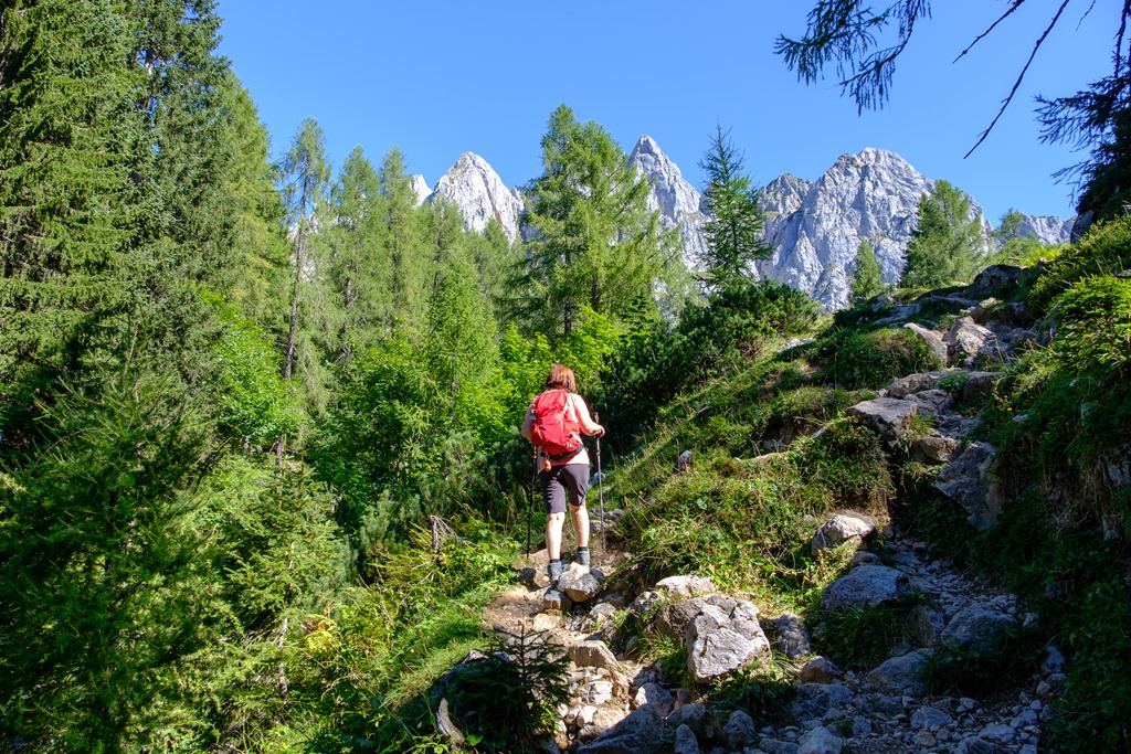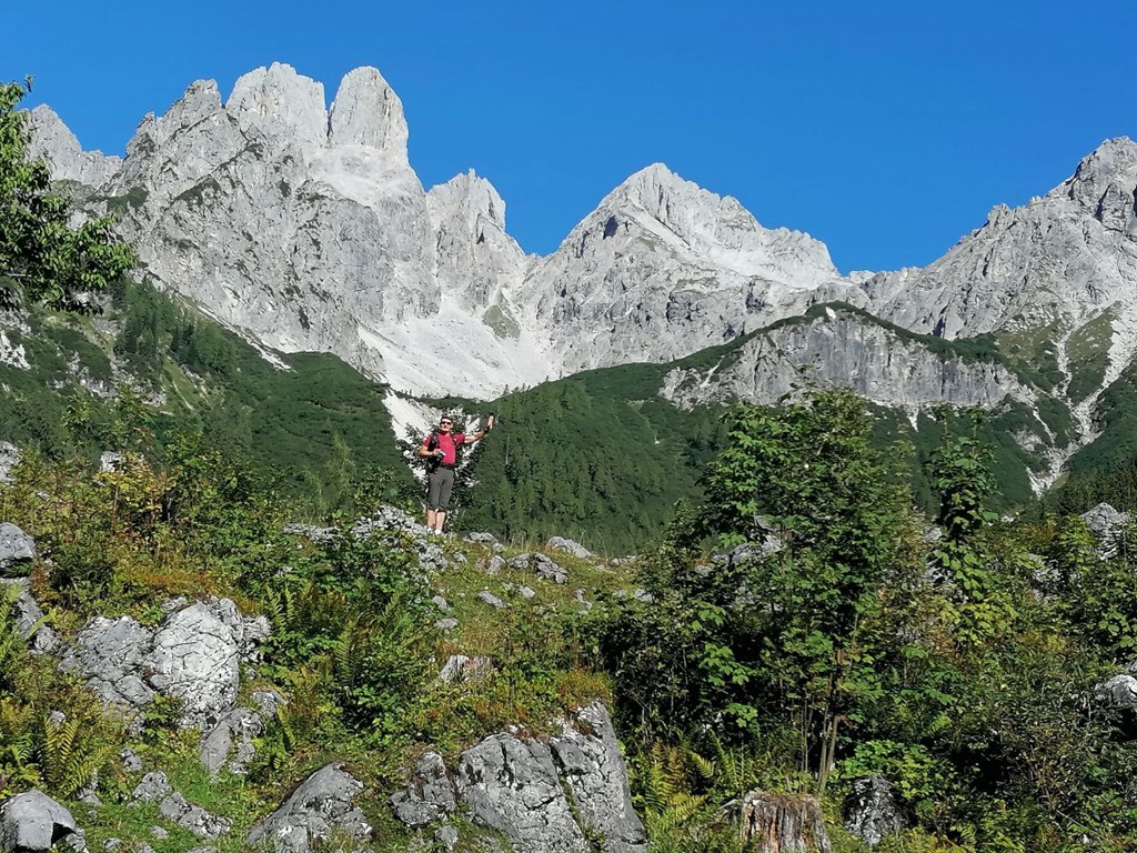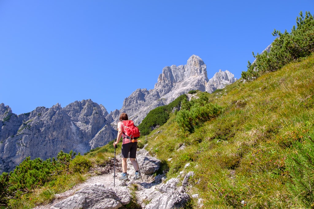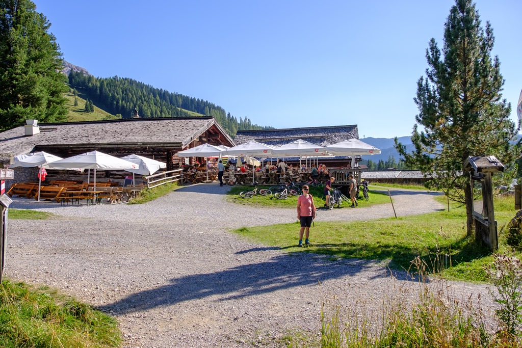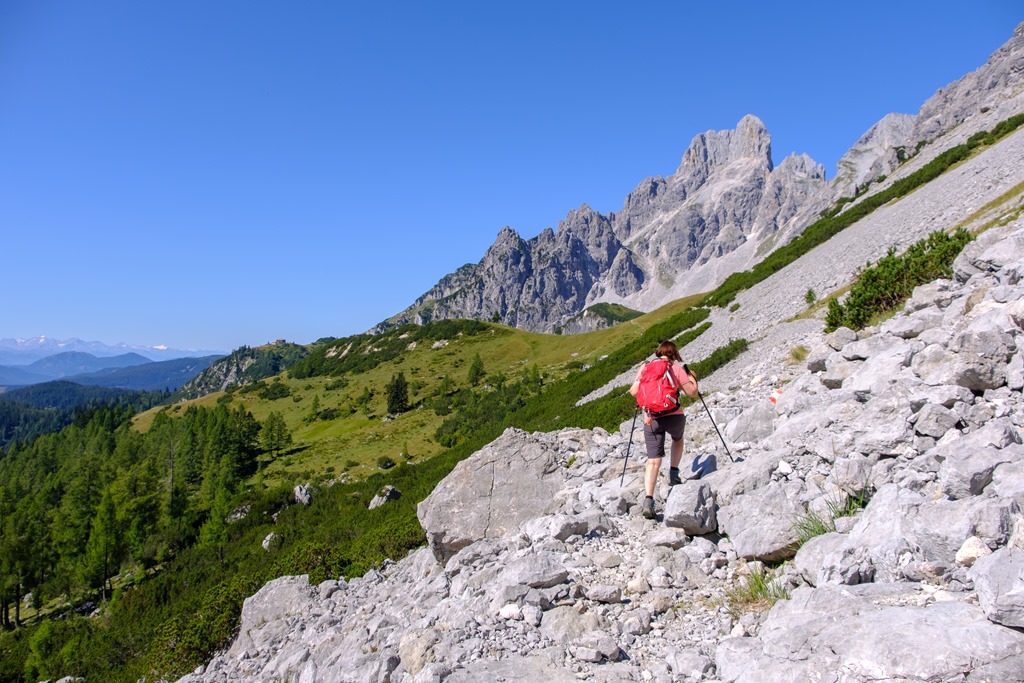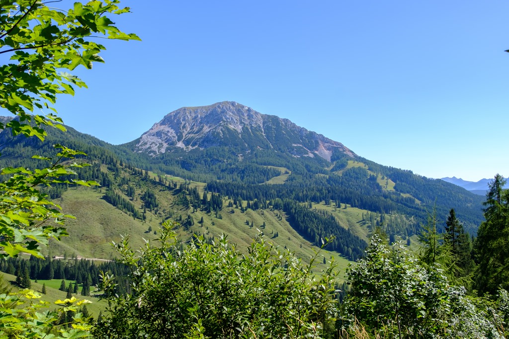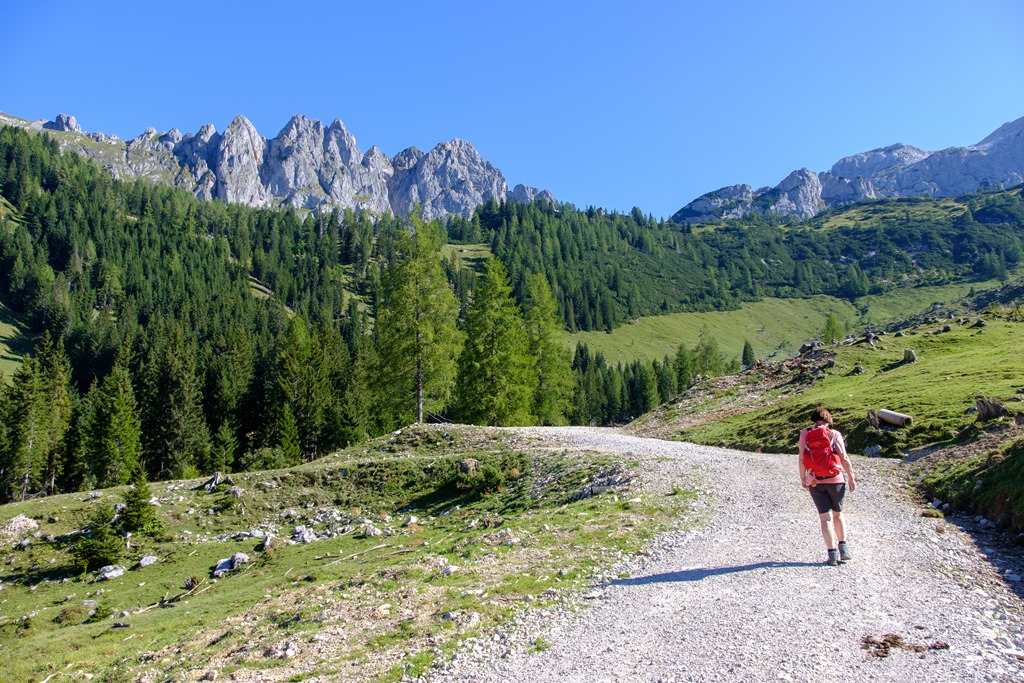 Angikával annyira el vagy ájulva az elénk tárulkozó pompázatos látványtól, hogy figyelmetlenek vagyunk és egy sajnálatos baklövést követünk el. Tudniillik a bugyellárisom az autó csomagtartójában marad, merthogy a tekintetem mágnesként vonzza a Hofalmok panorámája. Erre sajnos már csak akkor jövünk rá, amikor, elcsigázva, szomjasan és éhesen elérjük a Hopfpürglhüttét.