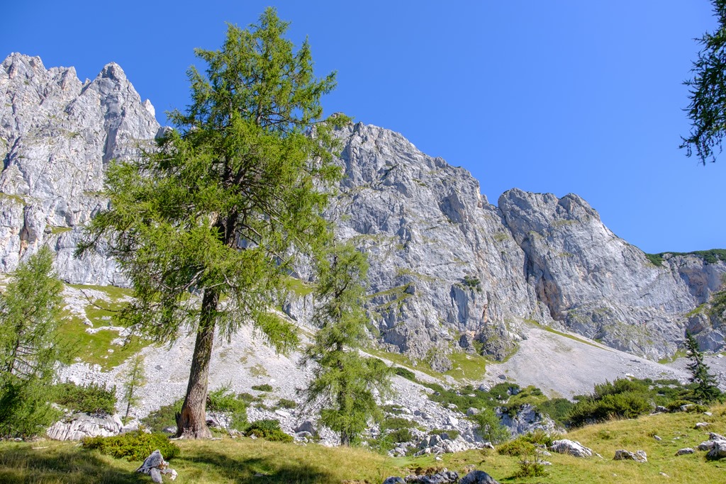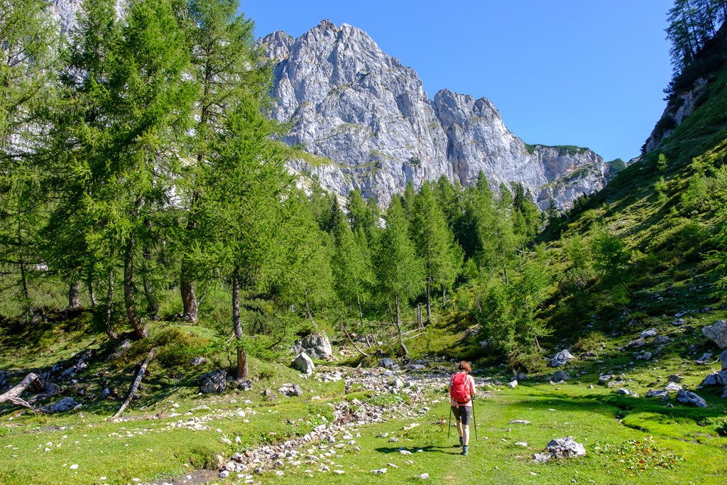 Az út eleje, pedig, mely a Warme Mandling patak mentén, az úgynevezett Kaserbodenon át visz, nem sejteti a későbbi meglepetéseket. Egy helyen vízeséshez érünk, és itt friss, jéghideg vízzel oltjuk szomjunkat, bár még van a magunkkal hozott tartalékból is. Egy fémpohár himbálódzik a hátizsákomon, ami most rendeltetésének megfelelően jut szóhoz.