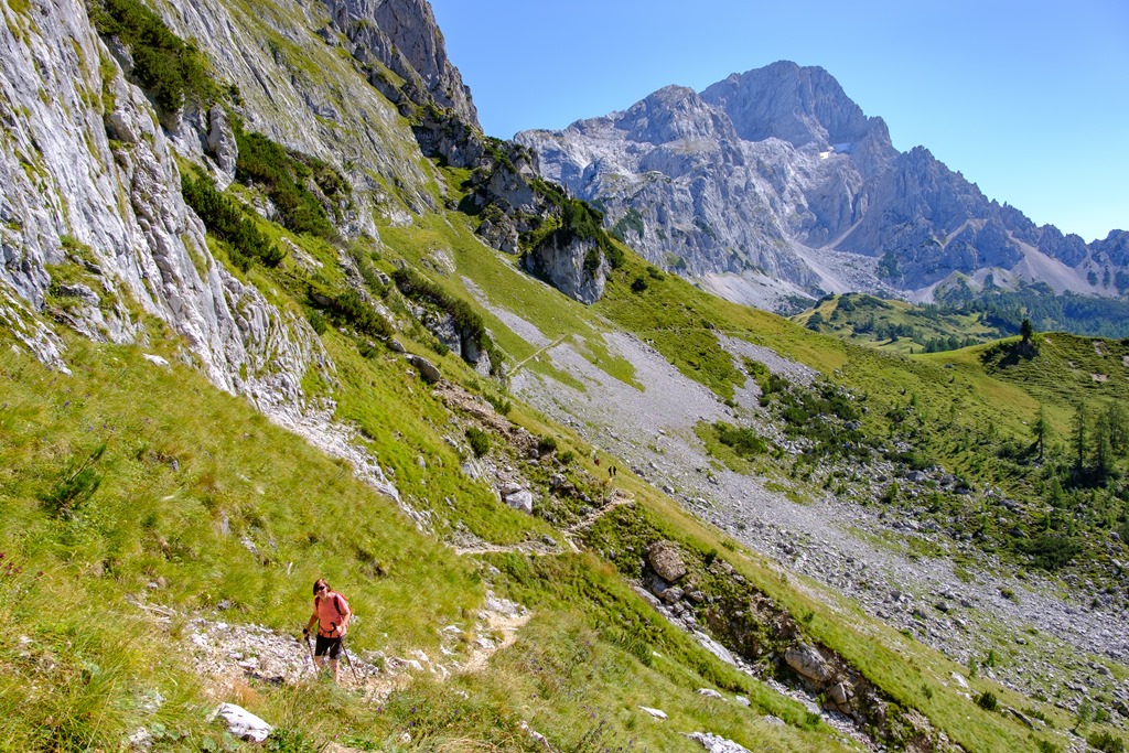 Szóval ráadásnak az úgy volt, hogy a Püspöksüveg alatti Hopfpürgelhüttehez vezető alpesi körút (Linzersteig) nehézségeit is alábecsülöm. De talán így lett jó, mert ha ismerem a nótát, akkor Angikát nem teszem ki a mégiscsak szokatlan kihívásoknak. Nem is az út önmagában teszi ki a dolgok sava-borsát, hanem azok a rövid szakaszok, melyek számtalan helyen, mély árkokat és bevágásokat kereszteznek. A tavasz és az olvadás beköszöntével itt hatalmas erők munkálkodnak, tonnás sziklákat megmozgatva. A sebes víz mélyen és szélesen belehasít a hegy húsába, ami egészen változatossá teszi a rajtuk átvezető utat. Először meredeken lemászni a görgetegek szintjére, majd onnan hasonló mutatványok mentén, visszaküzdeni magunk az útra.