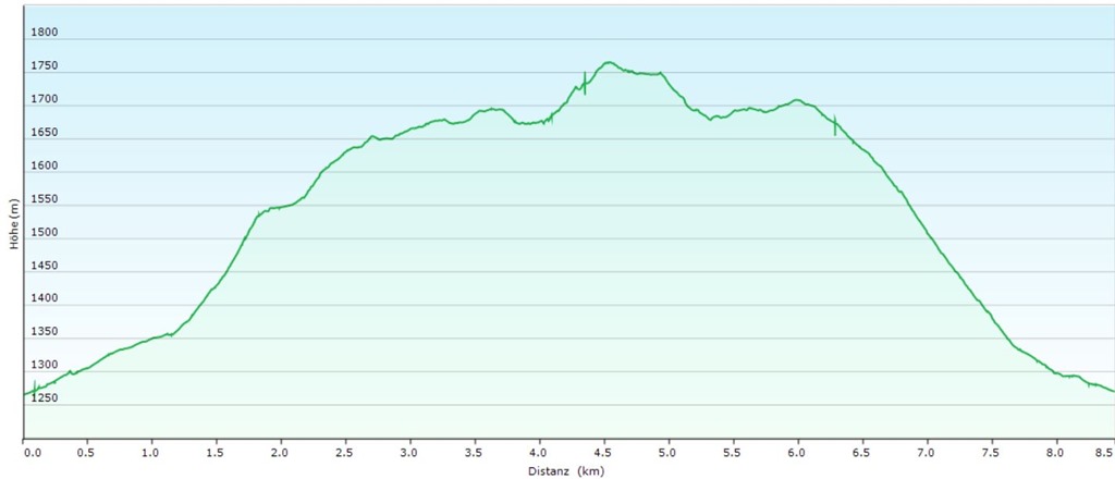 red A megtett táv (Oberhofalm [GPS: 47.476633, 13.531233], Kaserboden/Rinderfeld, Linzersteig, Hopfpürglhütte, 612-es turistaút, Hofalm, Oberhofalm) 8.4 km, 570 m szintemelkedés bruttó 5:00 óra alatt (nettó 3:10 óra)