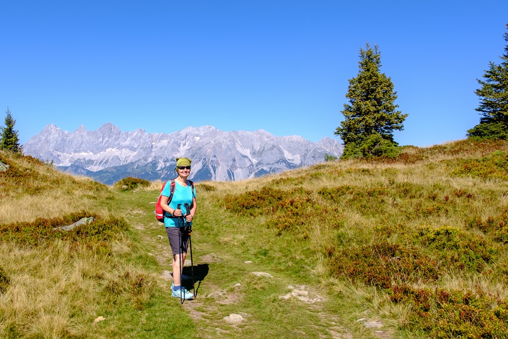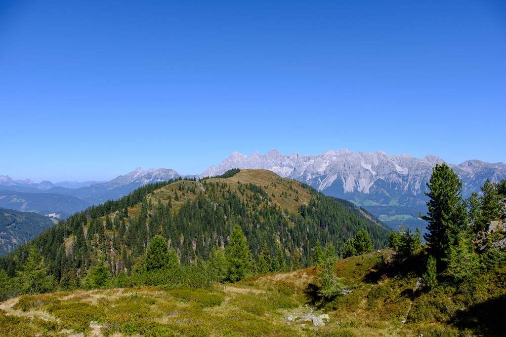 A visszafelé vezető ösvény a képen jobbra lent, szemben a Reiteralm a Schoberrel