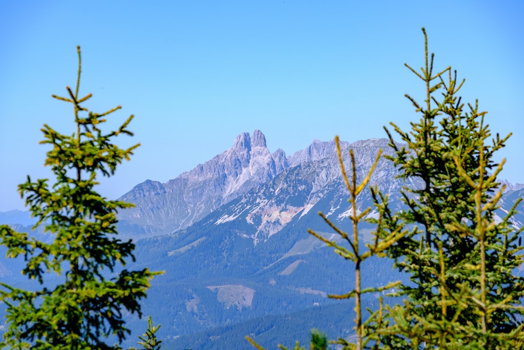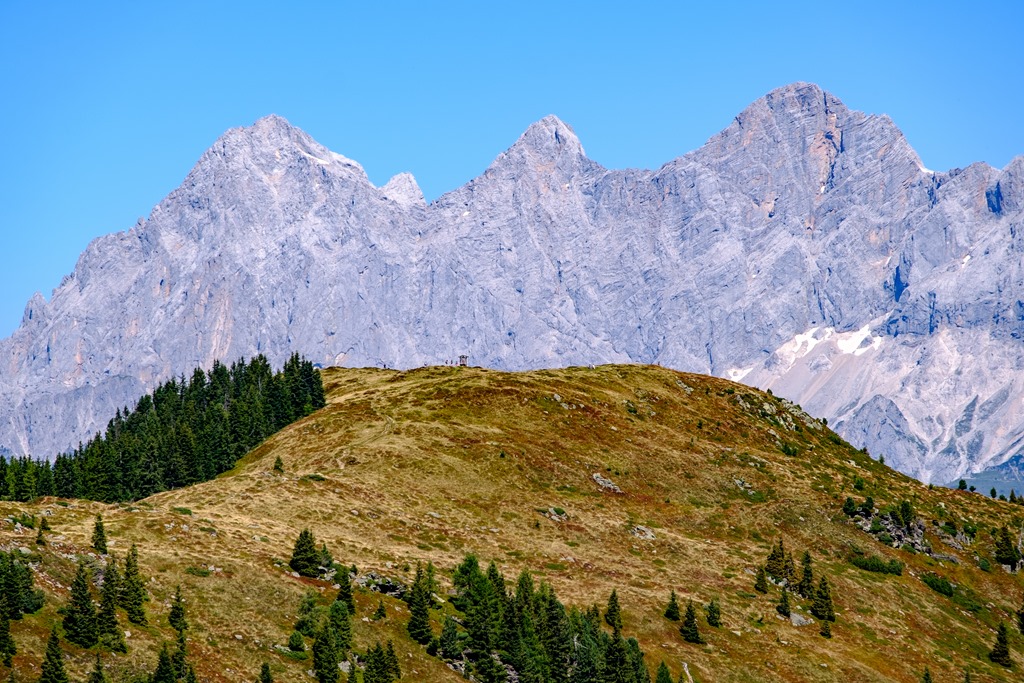 … és közelítésben, a háttérben a három legmagasabb Dachstein-csúccsal, balról Torstein (2948), Mitterspitz (2925) és Hoher Dachstein (2995)