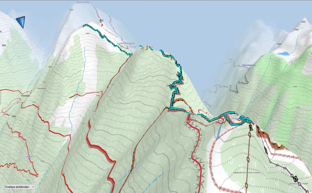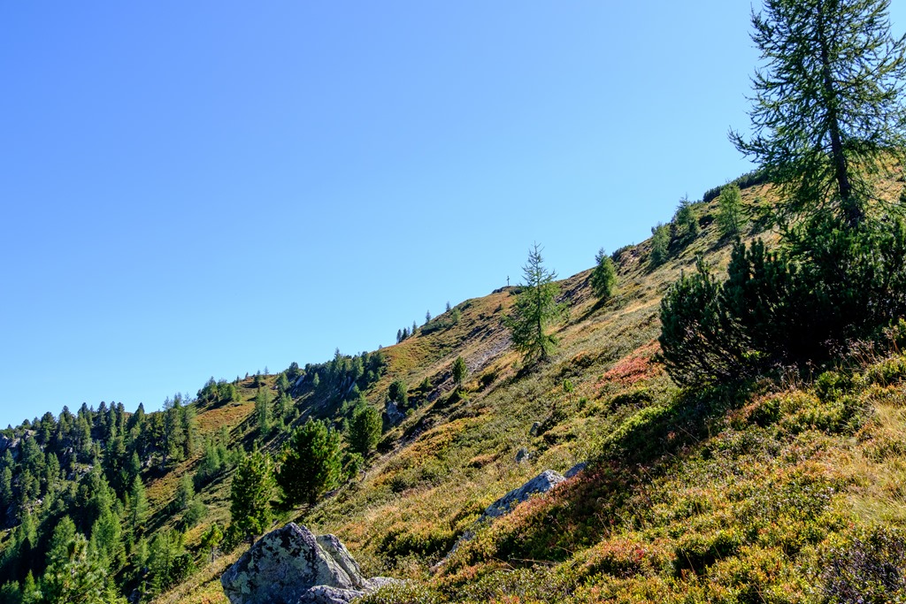 Először fel a Hochwurzen legtetejére, majd meredeken alászállunk a Hüttecksattelba (nyereg), innen hasonló dőlés szögek mentén fel a szép, lapos Rossfeldre (1919 m), ahol meg lehet egy cseppet pihenni. Átellenben, déli irányban jól kivehető a célunk, a Guschen. Még a csúcsra vezető ösvény fonala is kiválóan látszik.