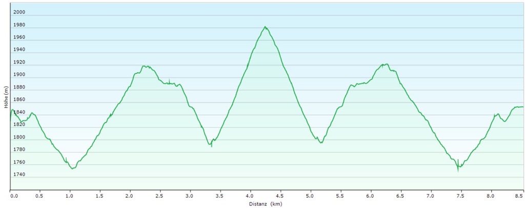 A Guschen, a 773-as jelzésű, másnéven Giglach-Höhenweg első bástyája, melyet még jó egynéhány csúcs követ, amennyiben valakinek kedve szottyanna egészen a Giglach-tavakig vándorolni. Természetesen mi most Angikával ilyen embert mérő tervekben nem gondolkodunk. Egyszerűen csak a Guschen skalpját kívánjuk begyűjteni. Ez sem néz ki kifejezetten egyszerű kalandnak. Tudniillik, ez egy afféle „hármashalom” túra, mint azt a profilja is elárulja.