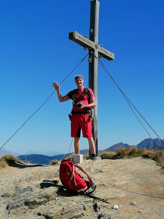 A Rossfeldről ereszkedés következeik a Latterfußsattelbe (nyereg, lenti képen) ahonnan, a Guschen csúcsára vezető cirka félórás kaptatás indul. Angika dicséretére váljék, percre pontosan, papírforma szerint érkezünk a kereszthez. Néhány felvétel elkészítése után lehuppanunk egy padra és elmajszoljuk a most kötelezően becsomagolt és magunkkal hozott alamát, nápolyit. A folyadékot is jól saccoltam, nincs hiányunk e téren sem.