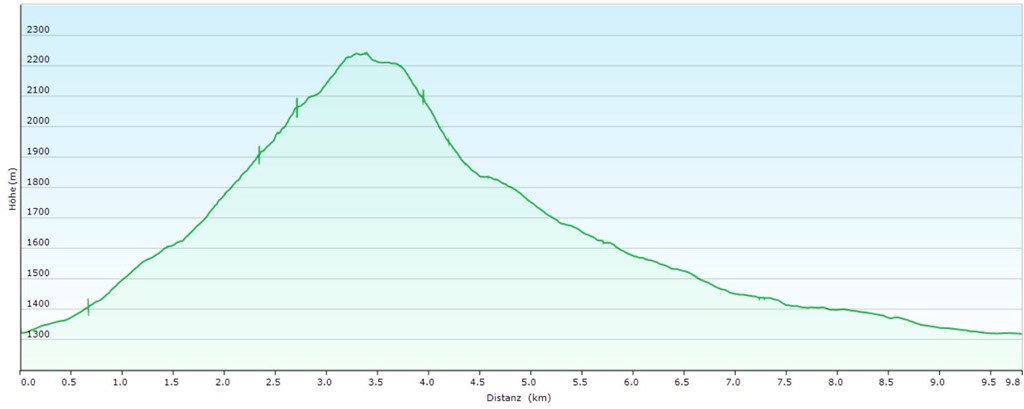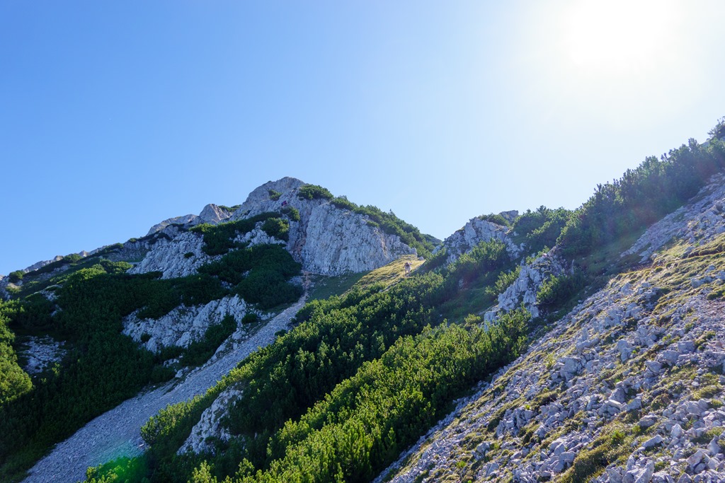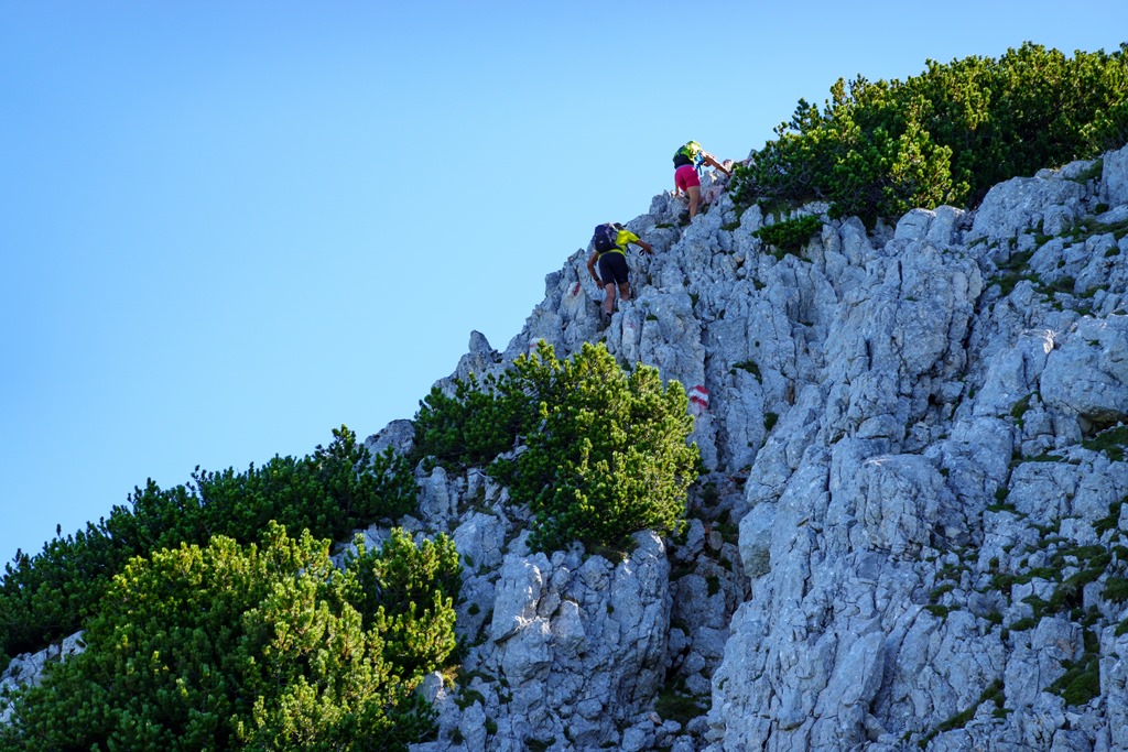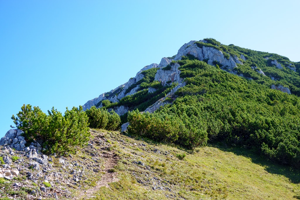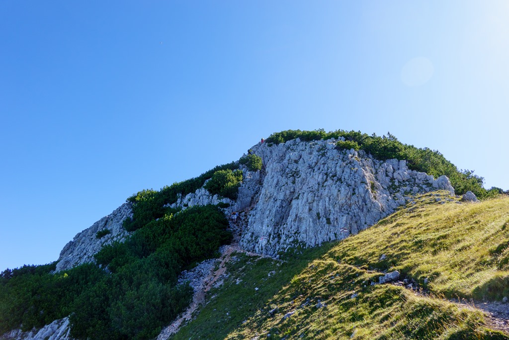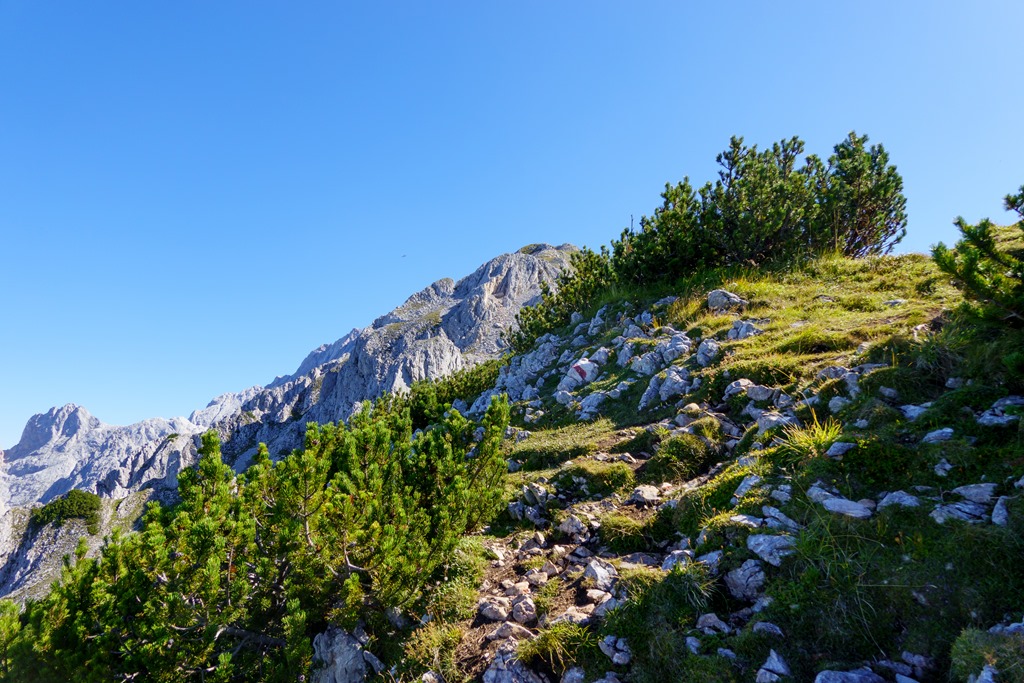 A délnyugati gerinchez a nyáron elhagyatott Rettensteinhütte parkolójából vezet a pirossal mindvégig jól jelzett út. Induláskor, az árnyékos részeken, alig lehet több tíz foknál, és így örömmel fogadom a nap által langymelegen kivilágított részeket. Ami nem tart sokáig, mert a nap heve hamarosan fokozódik. Először szép hegyi legelőkön át kanyarog a mérsékelt emelkedő, majd az Ahorneggalmot követően az út elkezd durvulni. Eleinte egyszerű sziklalépcsők jönnek, majd kisvártatva ott állok az első próbatétel lábánál. A túrabotokra itt már semmi szükség.
