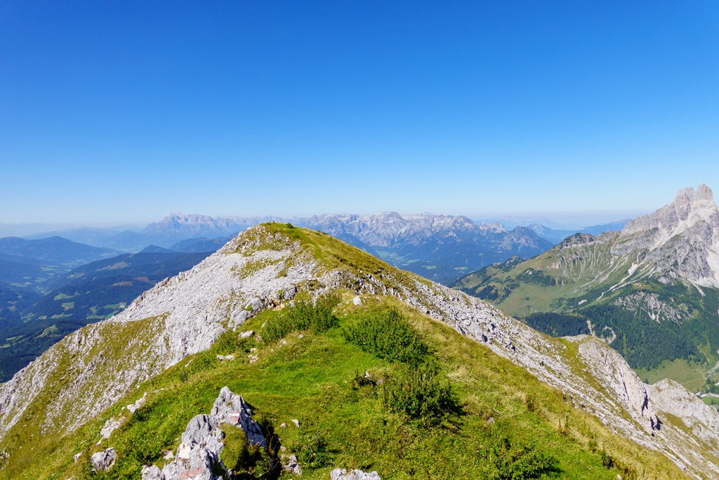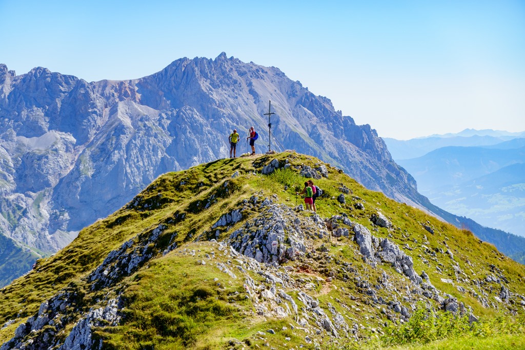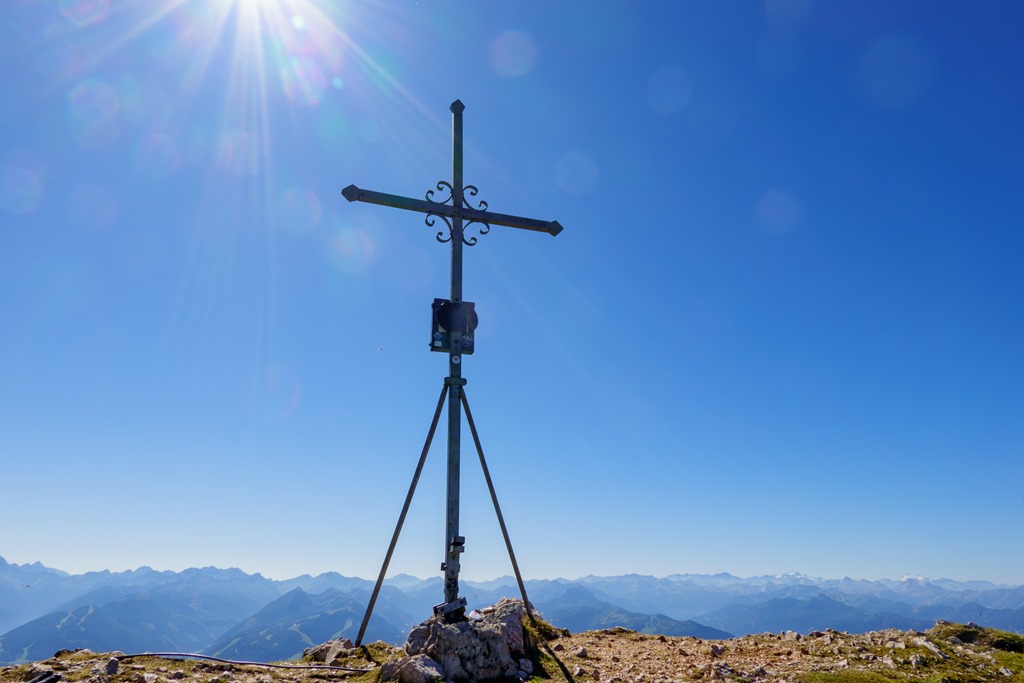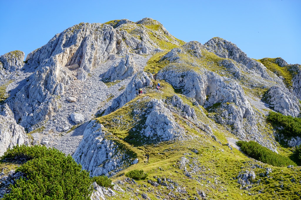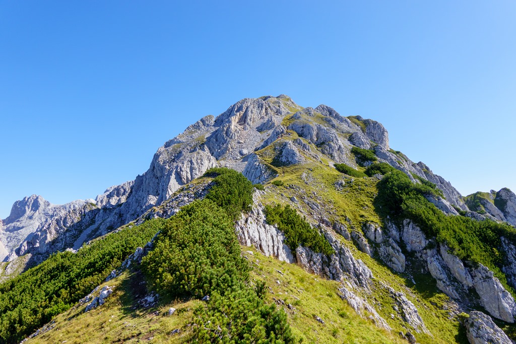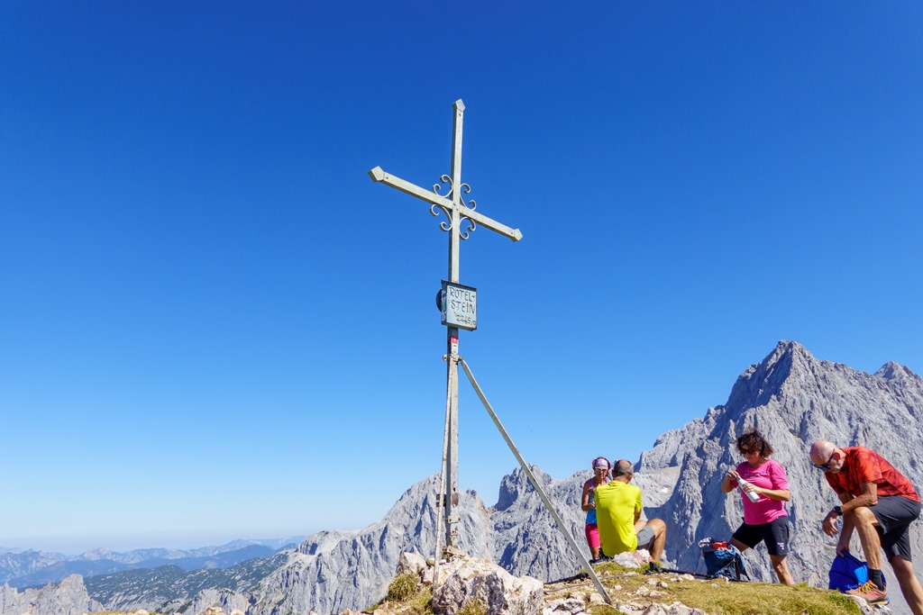 A délnyugati gerinchez a nyáron elhagyatott Rettensteinhütte parkolójából vezet a pirossal mindvégig jól jelzett út. Induláskor, az árnyékos részeken, alig lehet több tíz foknál, és így örömmel fogadom a nap által langymelegen kivilágított részeket. Ami nem tart sokáig, mert a nap heve hamarosan fokozódik. Először szép hegyi legelőkön át kanyarog a mérsékelt emelkedő, majd az Ahorneggalmot követően az út elkezd durvulni. Eleinte egyszerű sziklalépcsők jönnek, majd kisvártatva ott állok az első próbatétel lábánál. A túrabotokra itt már semmi szükség.