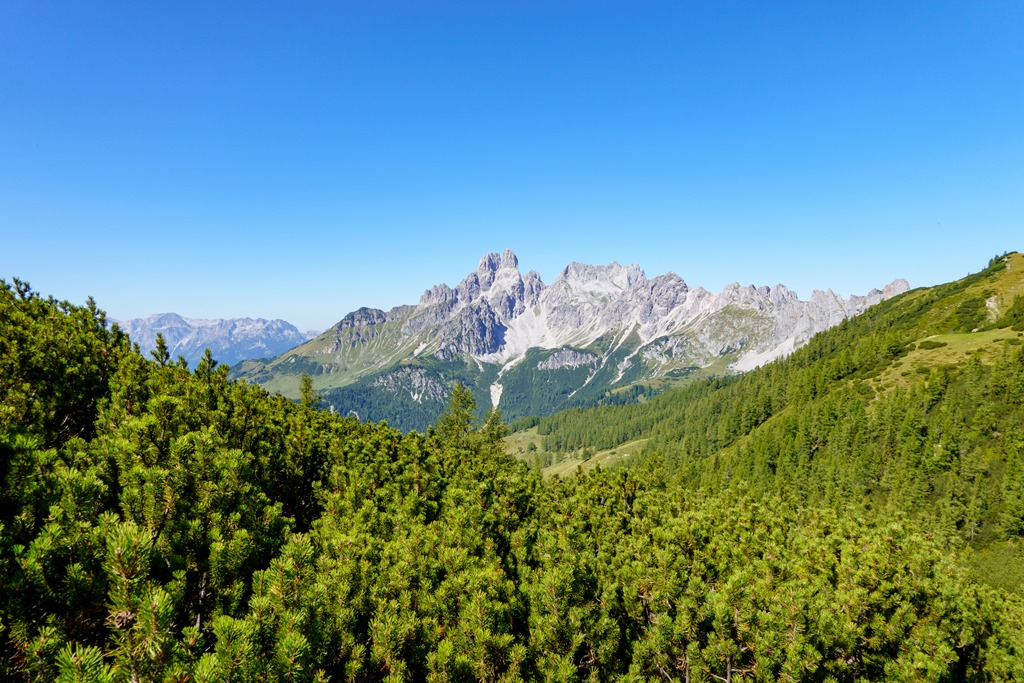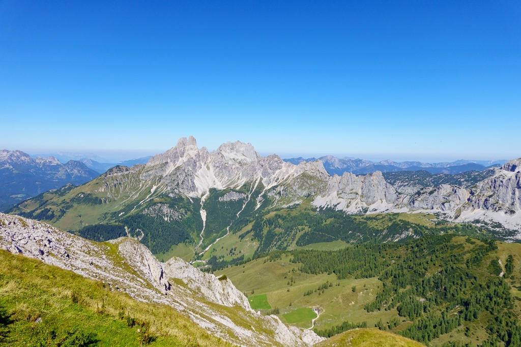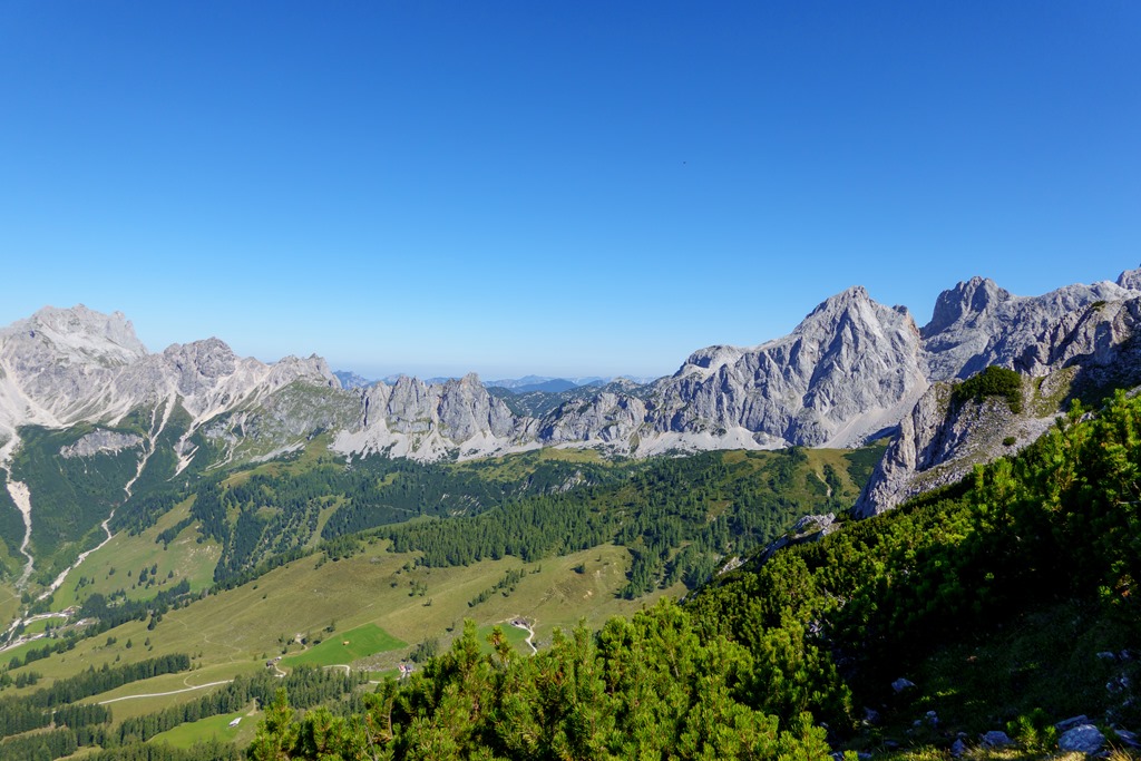 A lefelé vezető út vonala egyelőre nem sejtet semmi rosszat (balra a képben a Torsten, Mitterspitz és a Hoher Dachstein hármasa)