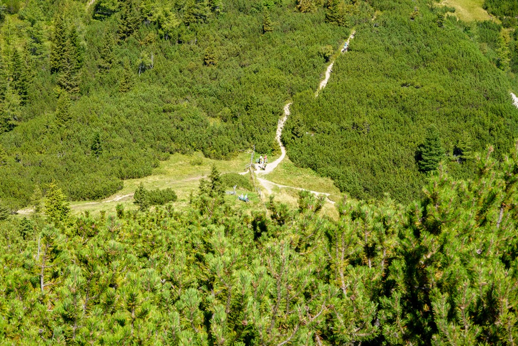A túrabotokat hamarosan ismét el kell csomagolnom, mert mászás következik lefelé, ami gyakorlatilag mindvégig így marad. Egyetlen fényképet készítek (lásd feljebb) egy hajmeresztő lemászás után, visszapillantásban, aztán felhagyok a fotózással. Kisebb gondom is nagyobb ennél. Nagy kő esik le a szívemről, amikor elérem a törpefenyős részt. Vége a felfokozott izgalmaknak, szerencsésen leérkezem.