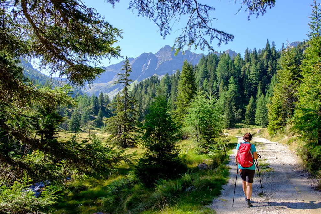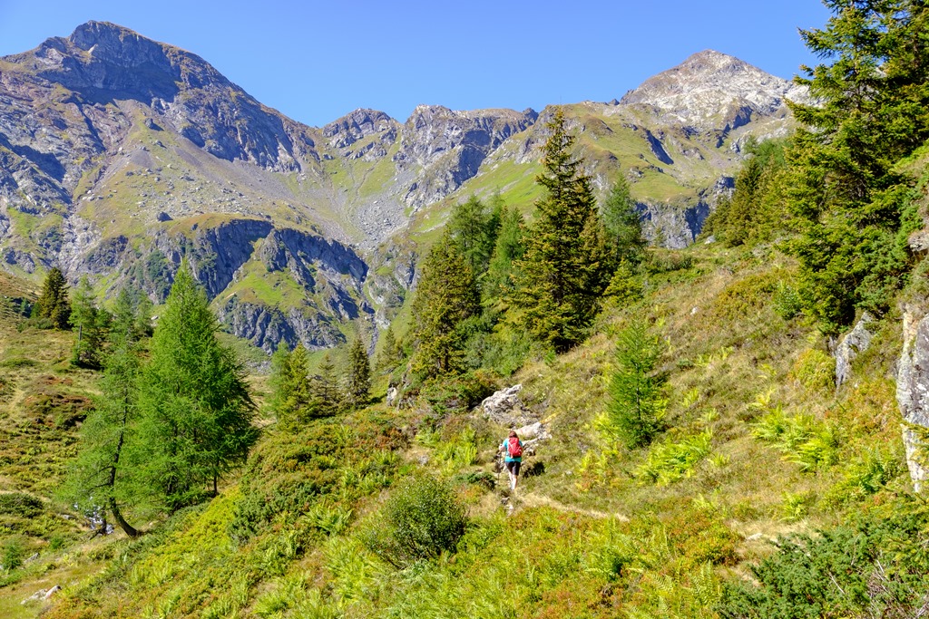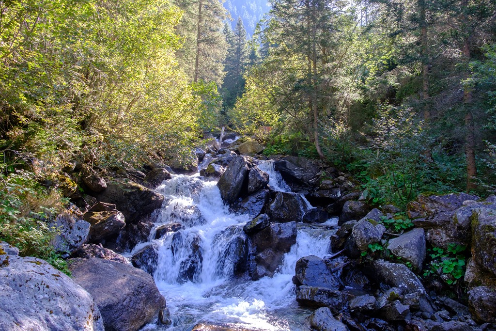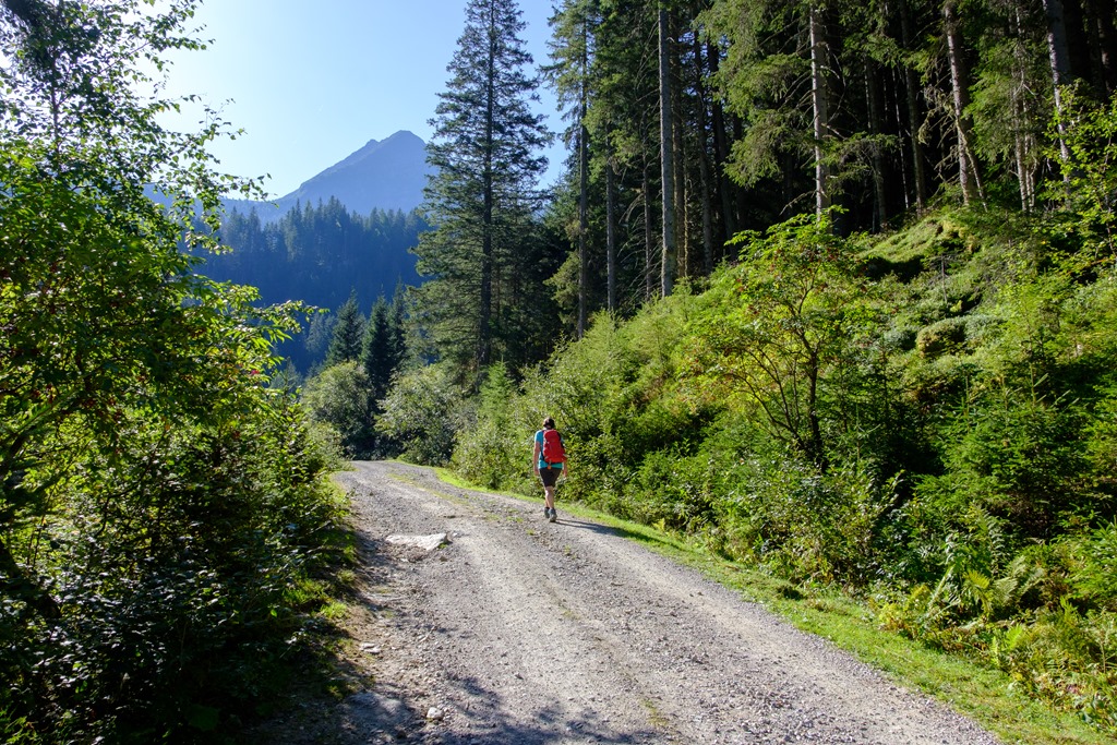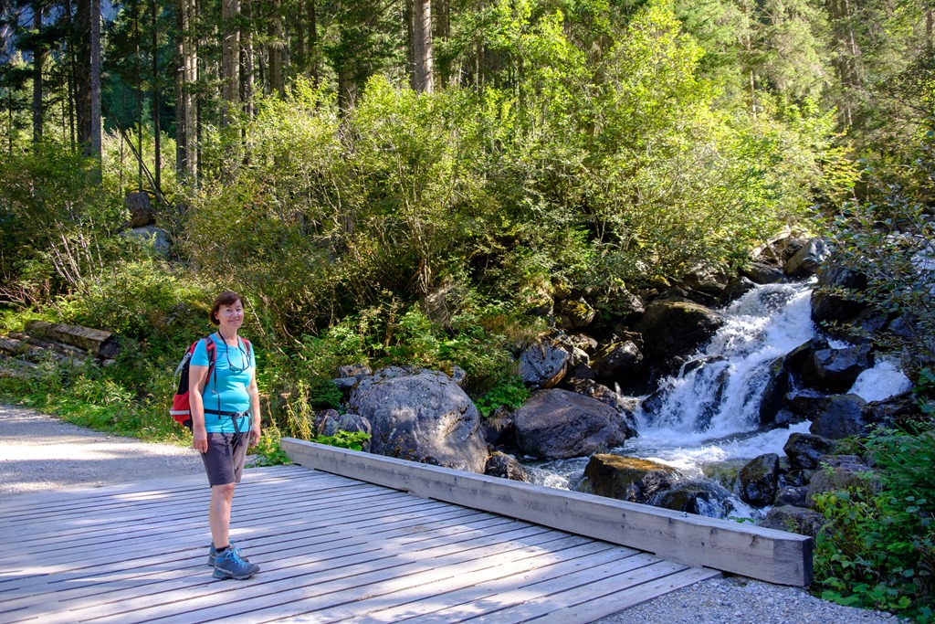 A parkolóból gyakorlatilag két különböző cél felé lehet megkezdeni a menetelést, mégpedig a Duisitzkarseet megcélozva, amit már ismerünk, avagy az említett Keinprechthütte felé. Kínálkozik egy út az Obertalbach jobb partján, ami így reggel a hegy teljes árnyékában van, illetve egy másik, párhuzamos út a patak bal partján. Mi ez utóbbit választjuk, mert vacogtatóan hideg a reggel, csak 9 C fokot mutat a hőmérő. A patak bal partját viszont már széltében hosszában megvilágítja a most még kellemesen melengető nap (fenti képen). A két út később, egy csobogó után, egyesül és jóillatú fenyvesek alján, a mindvégig hangosan zúgó patak mentén, enyhe kaptatókon terelget tovább (lenti kép).
