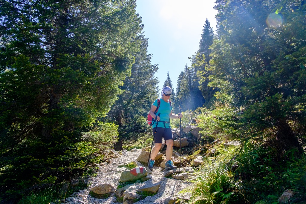 A turistaút egy ingoványos hegyháton kanyarog tovább. Valakik, valamikor, óriási erőbefektetéssel, nagy, lapos sziklákkal rakták ki az utat (fenti kép), hogy az azon érkezők el ne merüljenek a helyenként bokáig is érő sárban. Ez a kirakósdi olyan jól sikerült, hogy egy gyereksereg direkt is mezítlábasan, nagy élvezettel táncol végig a lapos, sima köveken. Jó két és félóra elteltével érkezünk a Keinprechthüttehez.