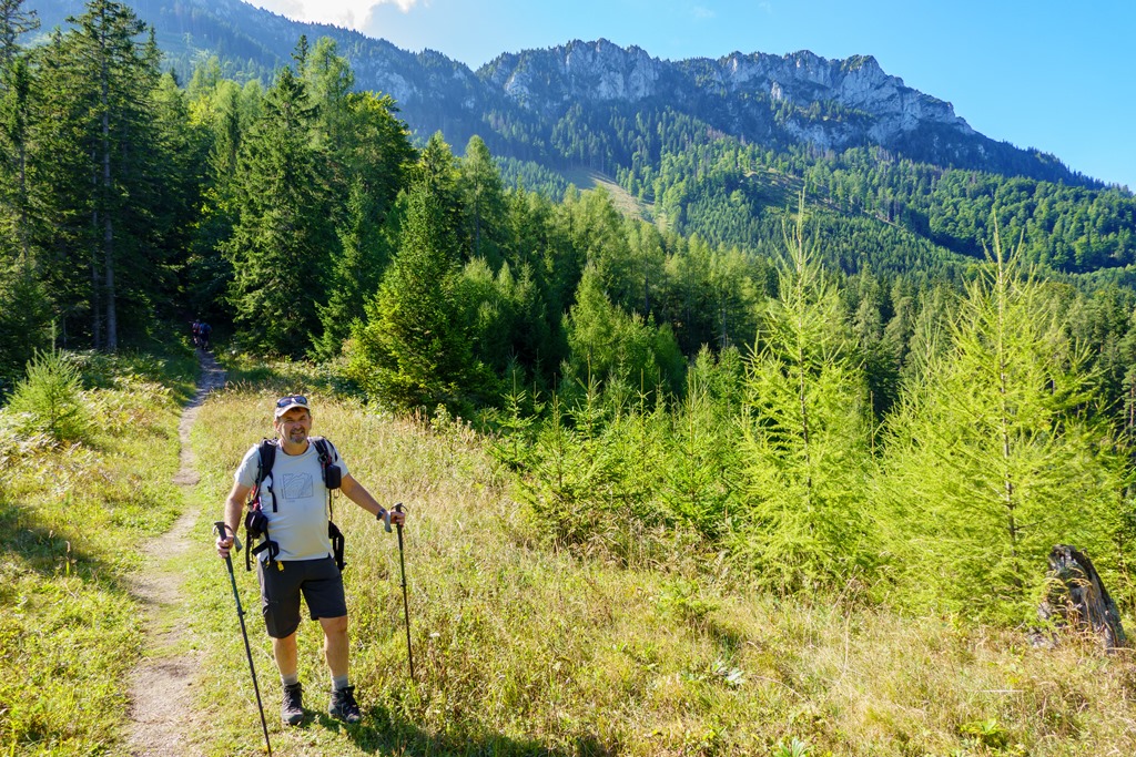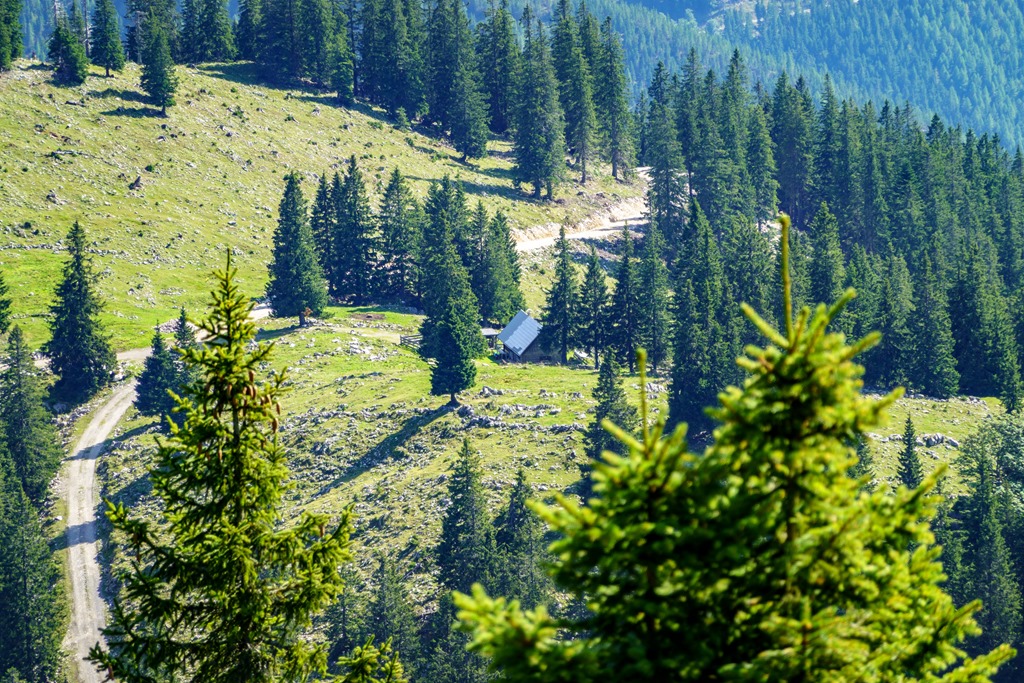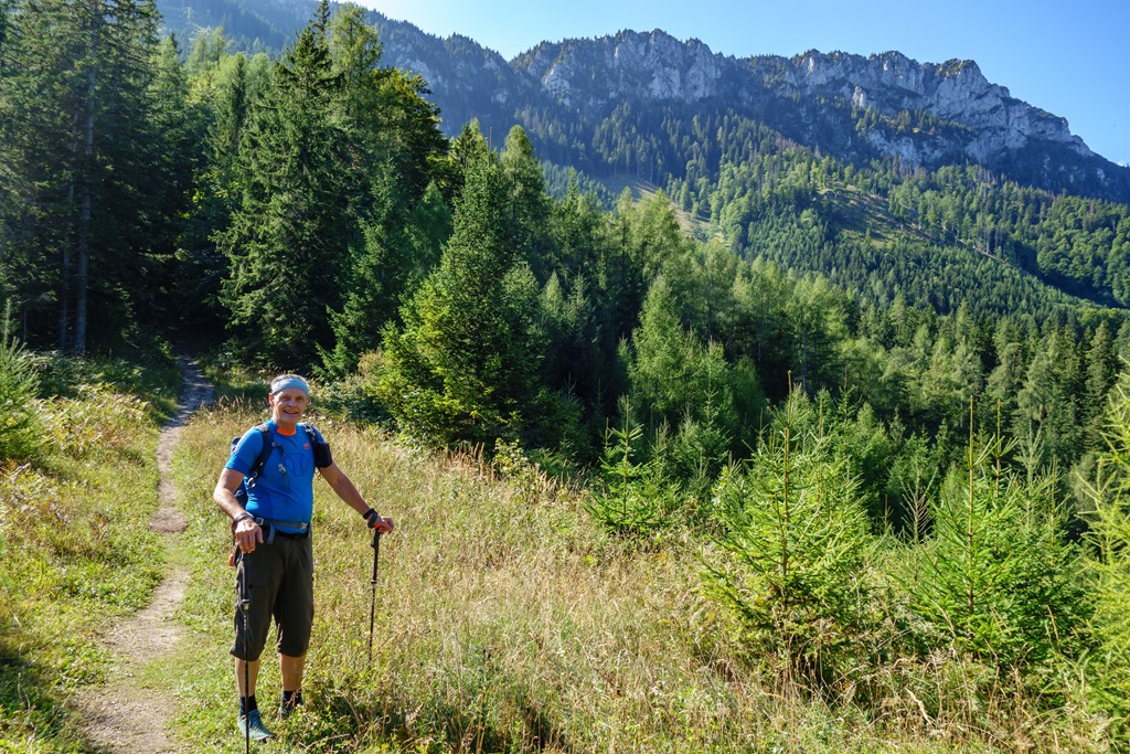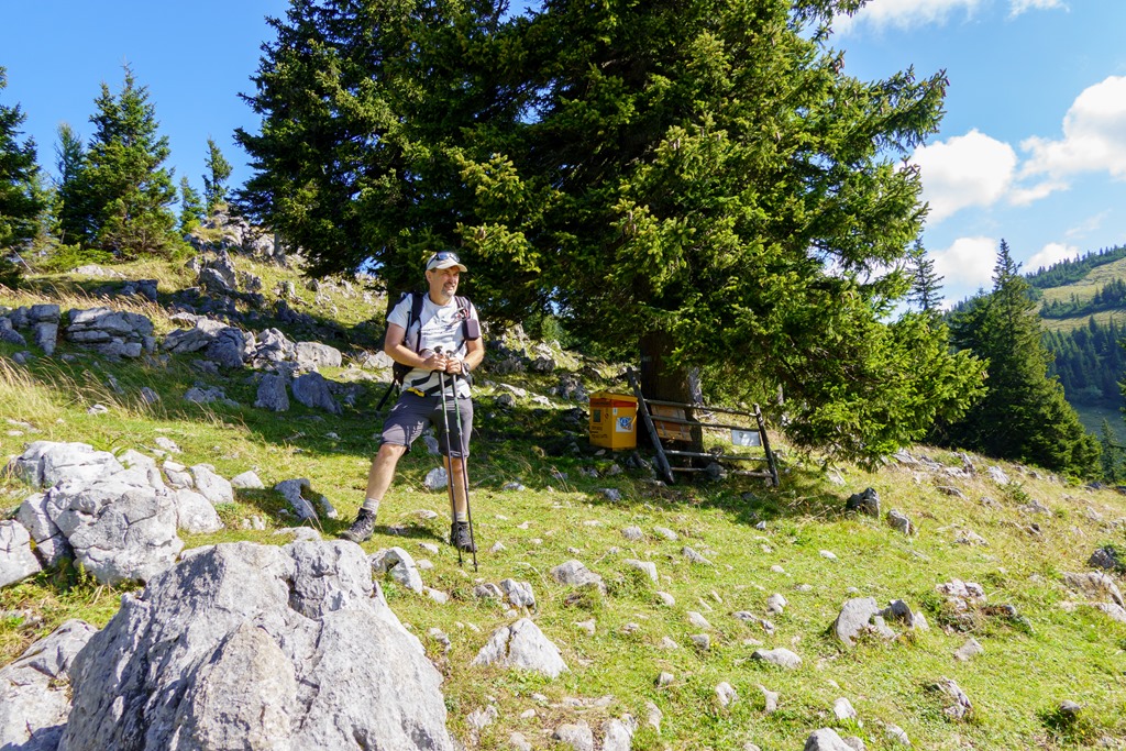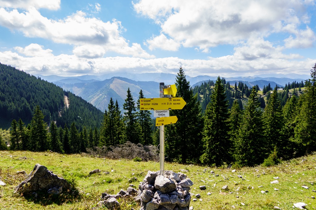 Na, de most még egyelőre csak későnyári élmények elé nézünk, amikor Zögernitz tanyáról, majdnem pontban 10:00 órakor nekilendülünk a magaslatoknak. Mivel egy jól látható piros nyíl azonnal útba igazít, gondolkodás nélkül letérünk mindjárt jobbra, az eredetileg visszafelére tervezett ösvényre. Már késő visszafordulni, amikor tudatosítjuk a ziccert, ami nem nagy gond, egyszerűen csak kaptatás helyett majd ereszkedés lesz a Schwarzauer Gippelről.