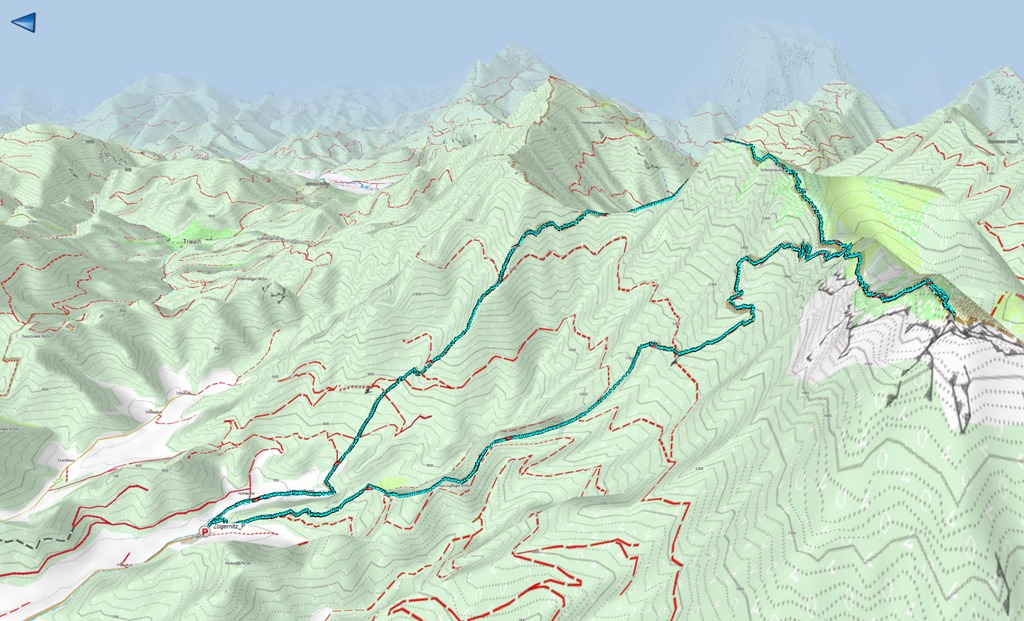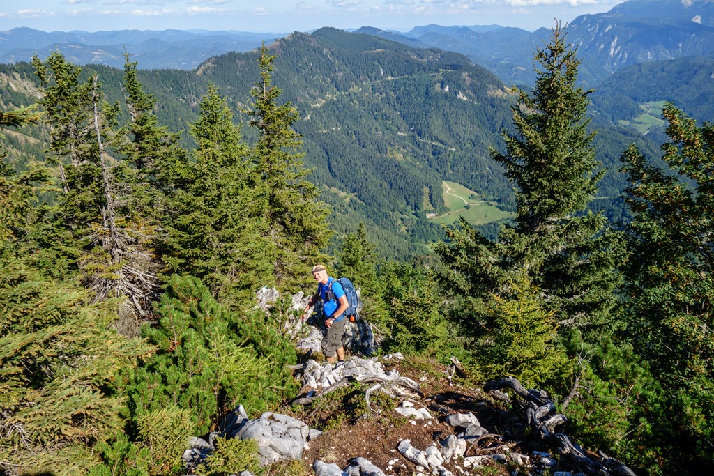 Jól megszolgált pihenőnk után jöhet az út kalandosabb része, vissza a Gippeltörlbe, a postaládához, majd onnan tovább végig a Schwarzauer Gippel csodás gerincén. Mármint „csodás” mindaddig, kilátásban, amíg meg nem kezdjük a nyaktörő ereszkedést. Teljesen nyilvánvaló tehát, hogy ez a télben itt, egy kifejezetten hágóvasazásra alkalmas terep. Már szomjasak vagyunk, amikor végre leérünk a Preinecksattelbe (nyereg), ahol lehuppanunk egy szép fatörzsre és a nehézségeket, sürgősen, némi további magunkkal hozott elektrolittal öblögetjük.