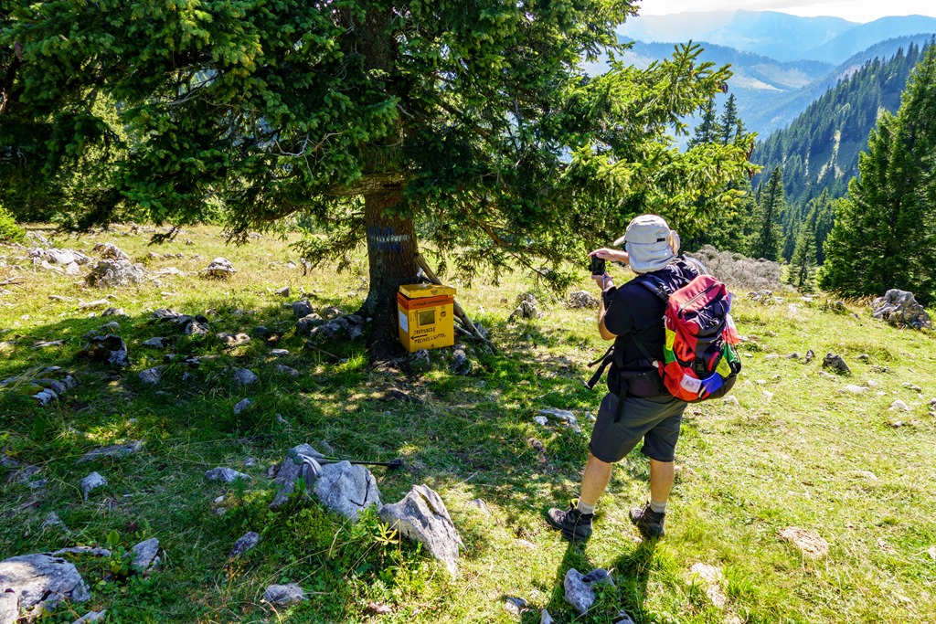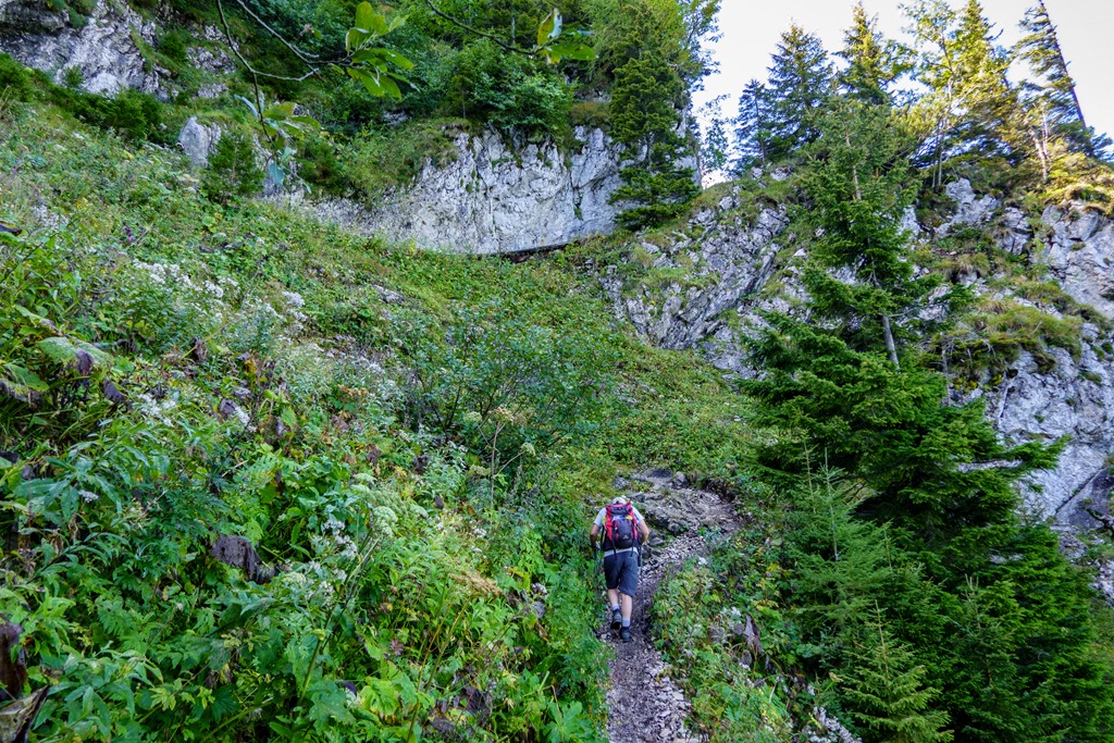 A hegy északi oldalán keresgéli az út, számtalan hajtűkanyarban, a felfelé jutás legjobb módját. Az előző napok esőzésé nyomán a sziklákat egy sikamlós, nedves, nyálkás réteg borítja. Lehet, hogy valóban jobb erre felfelé menni, mint itt lefelé (fenti képeken)? Indulástól számítva cirka bő két óra elteltével lépünk át a Gippeltörlön, ki a platóra. Itt mindjárt szembeötlik a sárga postaláda, amit évekkel ezelőtt valaki ide felhozott. Még egy jó fél óra innen a csúcs. Már nem emlékeztem rá, hogy ez a végső táv ilyen hosszú. Legfeljebb egy jó negyedóra volt valamilyen okból az emlékezetemben.