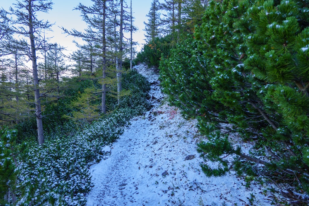 A Schneeberg platójára vezető turistautak közül (eltekintve a tisztán sziklamászó útvonalaktól) a Herminensteig a legmeghökkentőbb, a legigényesebb és tehát a legkalandosabb, még akkor is, ha az Alsó Herminensteiget kihagyjuk a képből. Van már négy éve, hogy utoljára erre jártam. A mai nap, kilenc órányi napsütéssel, gyenge légmozgással, elvileg tökéletesen megfelel egy ilyen kiránduláshoz, hacsak, az éjjel nem húzott volna át a hegyen egy havazást is hozó front.