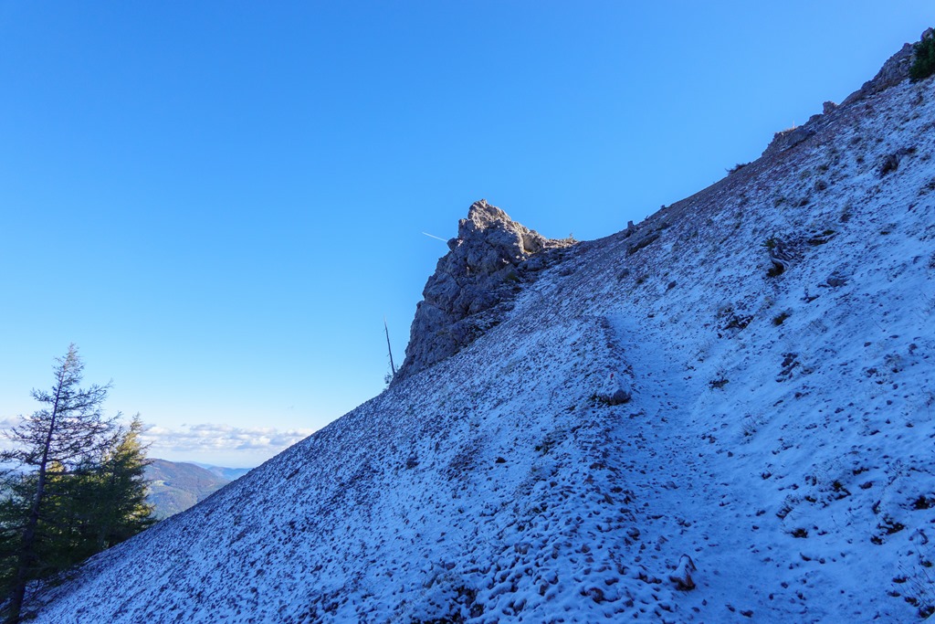 Háromnegyed tíz lehet, amikor elindulok Schneebergdörflből. Zimankós, de napos az idő. Ahol akadálytalanul tekinthet rám a napocska, ott kellemesen érződik múlóban levő ereje. Máshol meg kesztyű, tökfedő is elkel. A Schneidergraben még optimális körülmények között sem tartozik a kedvenceim közé. Egy mindig sötét, meredek, huzatos, visszataszító árok, felszórva sziklagörgeteggel, nehezen járható murvával. Az árok szájában, egy táblán, 30 percben van megadva a Grafensteig elérésének időtartama, amiről tudom, hogy teljesen hamis. Legalább egy negyedórát kell hozzáadni. Ez valóban így is van, cirka 11:00 órára bukkanok ki a gyengén behavazott ösvényre (fenti képek).