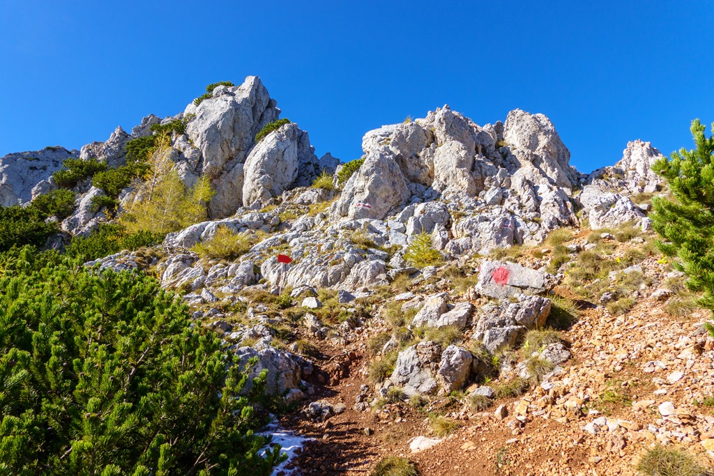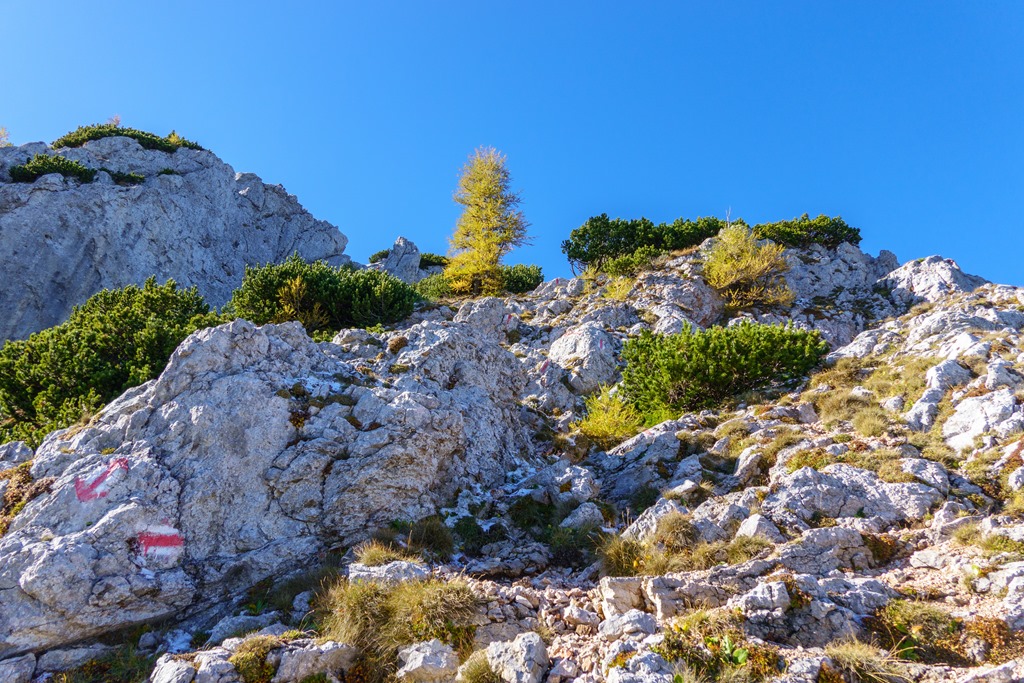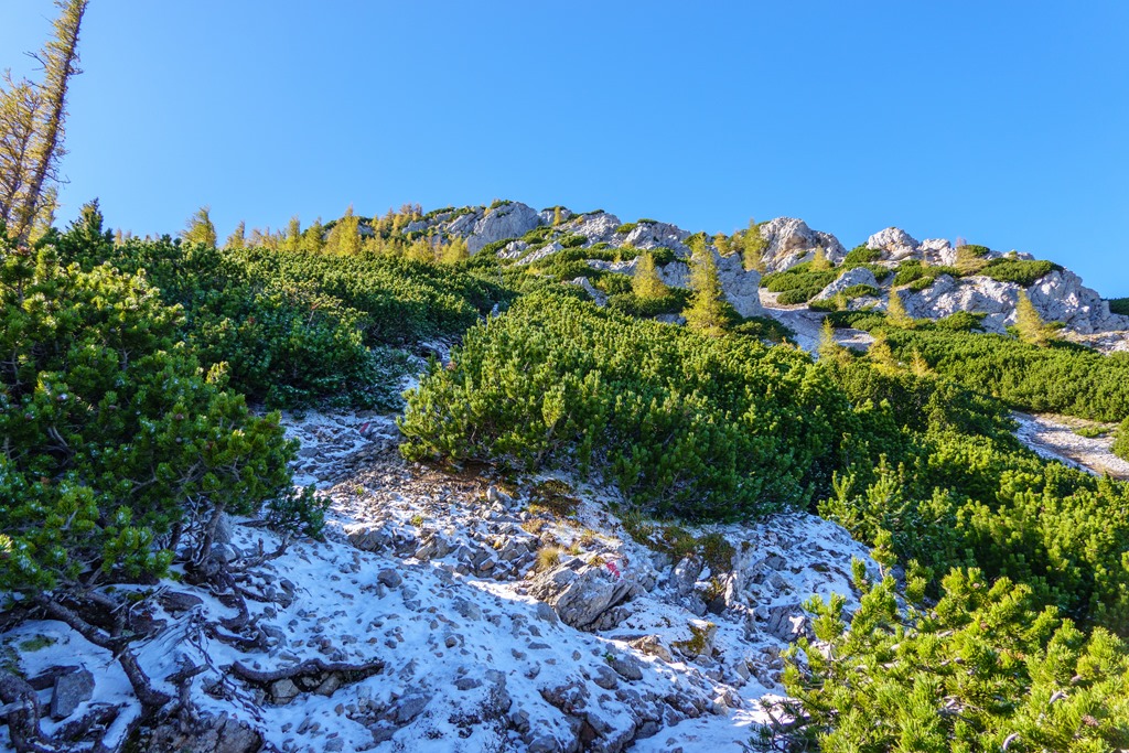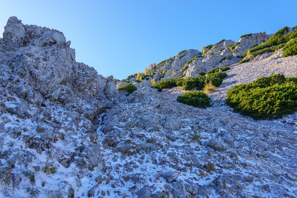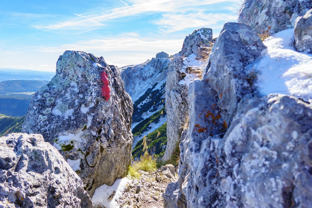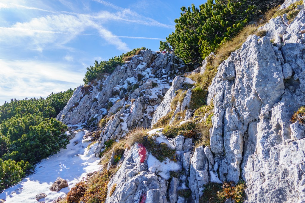 Az árnyékban levő szakaszok gyengén porcukrozottak, de érdekes módon sehol sem csúszós a terep. Még a vastagabb hórétegeken is van jó tartása a bakancsnak. Az út pirossal kitűnően jelzett (fenti képen). Ennek ellenére, legelső alkalommal (2012-ben), mégis sikerült elvétenem. Nem szívesen emlékszem vissza erre. Bár akkor már maratoni futóversenyeken edződtem, a lábizmaim mégsem nőttek fel az ilyen kalandokhoz, és begörcsöltem, többször is. Most elégedetten konstatálom, hogy az évtizedek adta-hozta gyakorlatok nyomán, ilyen szempontból, a Herminensteig már meg sem kottyan.