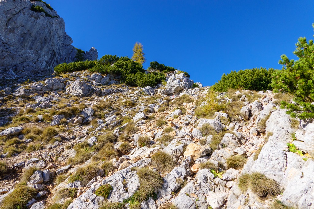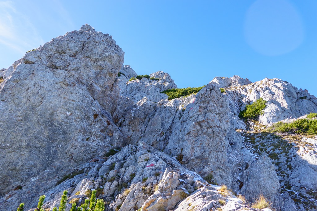 A Felsö Herminensteig az Alsóval összevetve, „gutmütig”, azaz jóindulatú. Mindezek ellenére nem elhanyagolható igényeket támaszt, különösen a második fele, tudniillik a kulcspont feletti rész. Haha, kulcspont (fenti képek)! Valószínűleg sokaknak beletörhetett itt az útba a bicskájuk, mert mint látom, nagy piros nyilak terelgetnek egy új ösvényre, ami rövidre zárja eme 2-es szintű kulcspontot. Aki tehát akarja, bevállalhatja, vagy megkerüli.